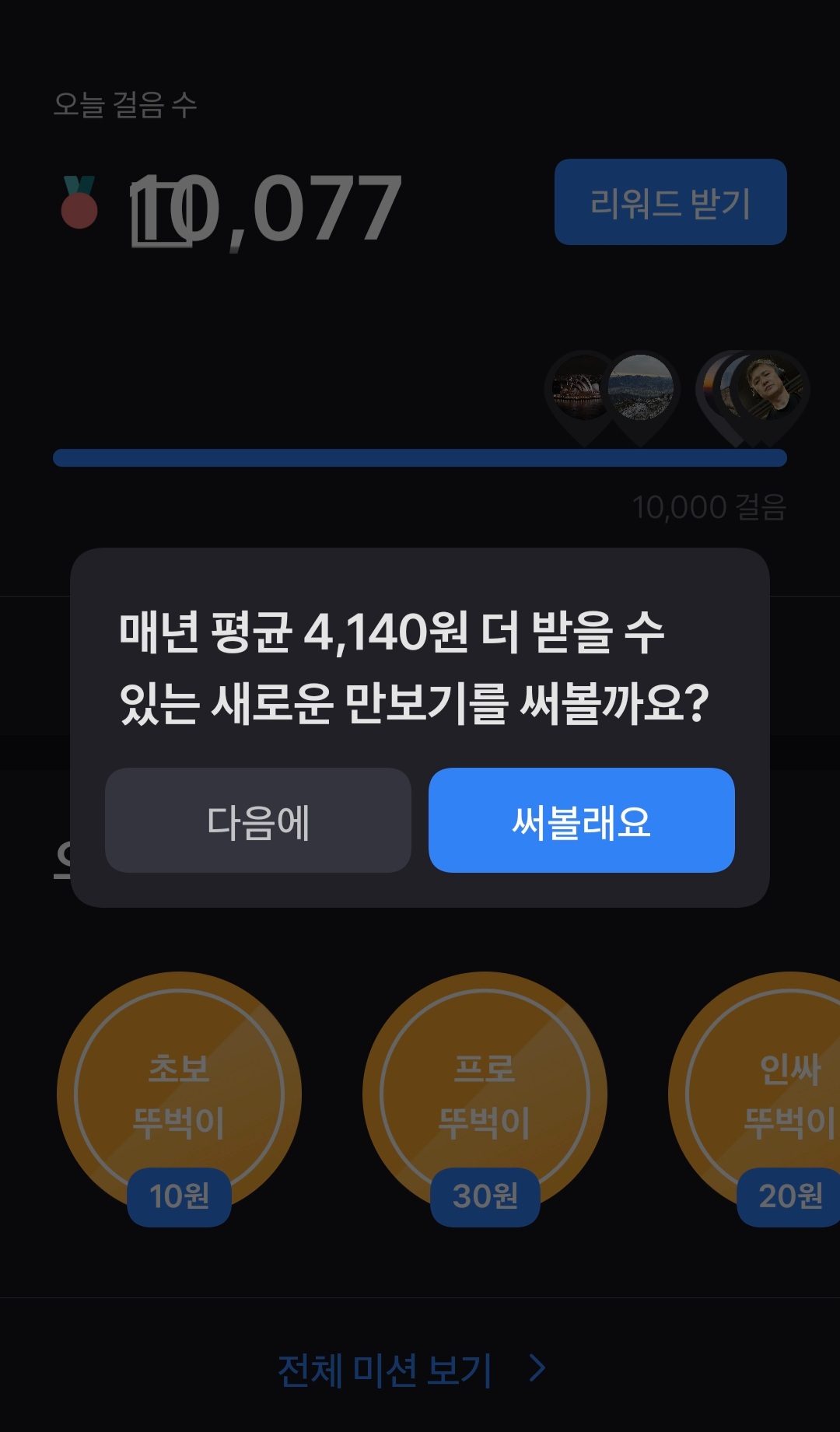 . 현재 보고 계시는 만보기는 새롭게 업데이트된 버전으로, 이전 버전에서 사용하신 친구와 같이 걷는 미션은 제공되지 않습니다. 대신 다른 미션 수행을 통해 만보기 리워드를 받으실 수 있으니 서비스 이용에 참고 부탁드립니다.