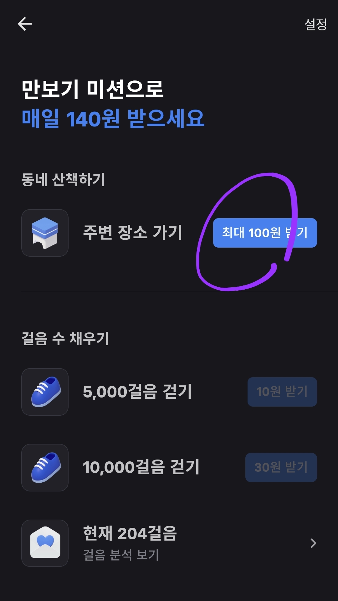 . 매일 24시(자정)에 걸음 수와 받지 않은 만보기 미션 리워드가 0원으로 초기화됩니다. 자정이 되기 전에 오늘 쌓인
