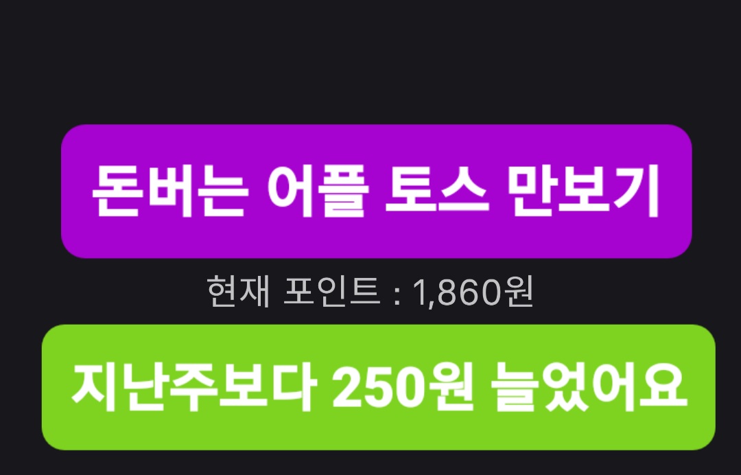 새롭게 변한 토스 만보기로 하루 최대 140원씩 모아봤습니다. 최근에 업그레이드해서 총금액은 그렇게 많지 않지만 돈 버는 이 어플은 지난주 보다 250원이 늘었다고 제게 알려주는데 일단 줄지 않아 기분은 좋습니다.