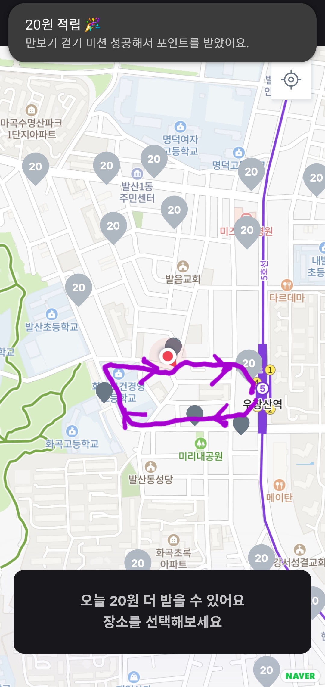 동네 산책하기는 [아래사진] 좌측처럼 20으로 표시된 포스트를 찾아 걸어 주면 됩니다. 저 같은 경우에는 화살표 방향으로 5군데를 산책했습니다. 최대 5개로 이것을 모두 마치면 20이라는 숫자 표시가 다 사라집니다. 미션 장소에 도착하면 오른쪽 사진과 같이 "미션 장소에 도착하셨네요. 20원을 받으세요"라는 메시지가 뜨면서 스마트폰에 진동이 옵니다.