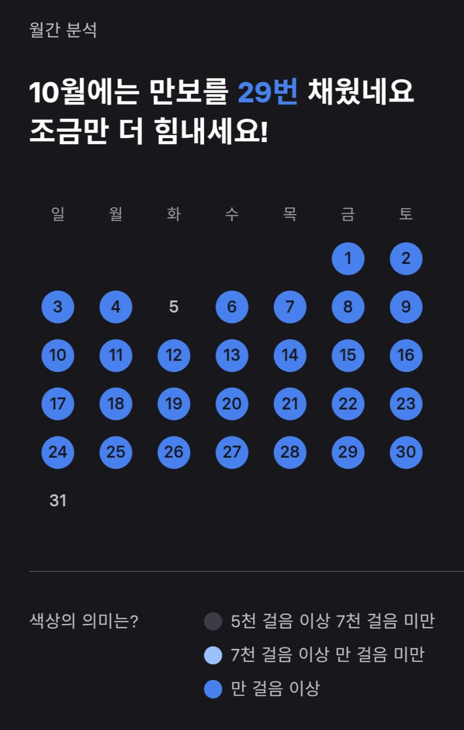 [아래 사진]은 토스 만보기 어플에서 보여주는 저의 걷기 월간 분석 사진입니다.