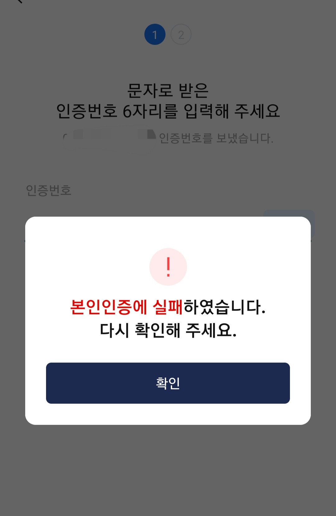 본인인증과정에서 "문자로 받은 인증번호 6자리를 입력해 주세요."라고 하면서 "********" 인증번호를 보냈습니다."라고 하면서 "본인 인증에 실패했습니다. 다시 확인해 주세요"라는 팝업 메시지가 도착합니다.