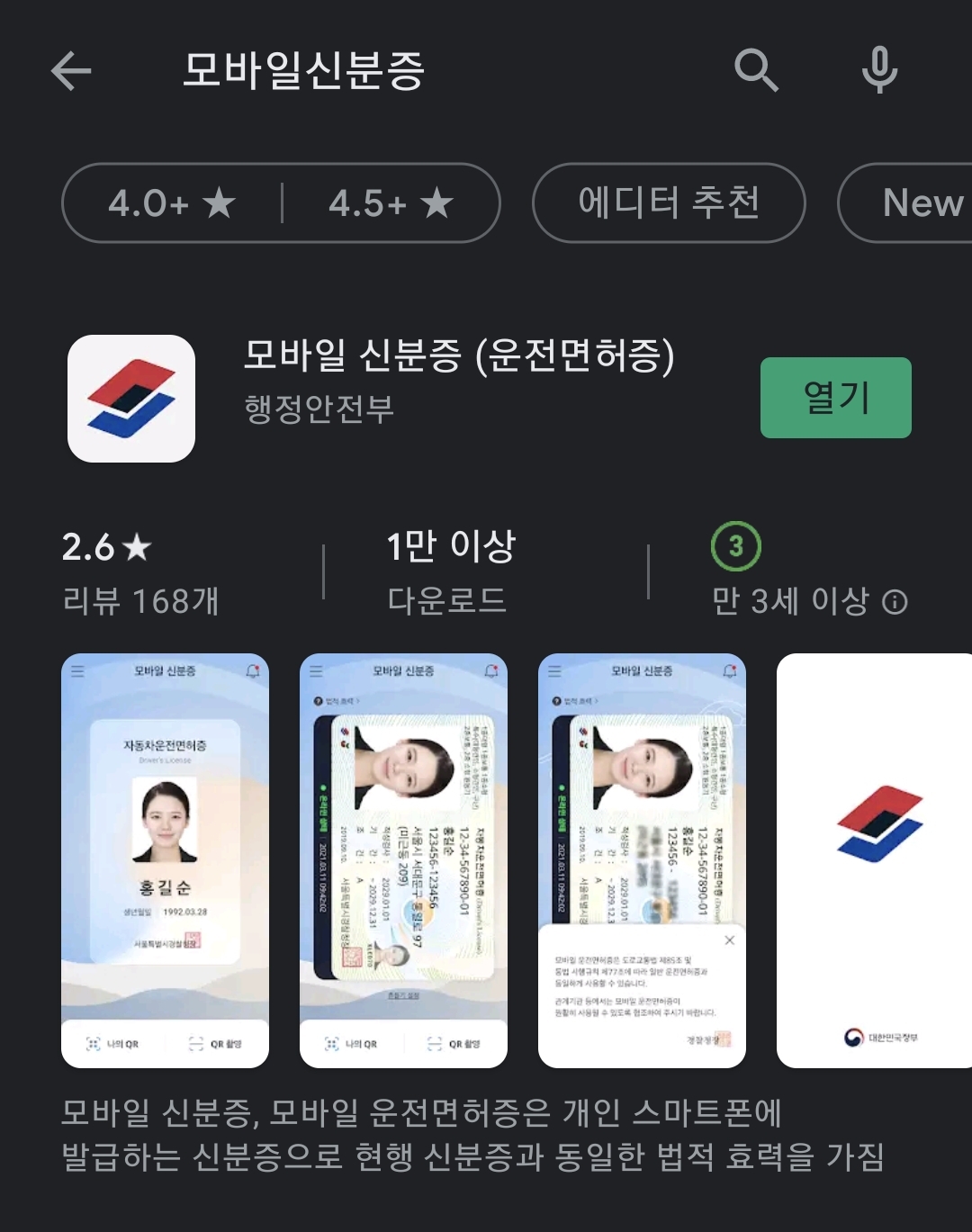 오후가 되니 플레이 스토어에서 이 "모바일 신분증 (운전 면허증)" 어플이 [아래 사진]과 같이 검색되더군요. 반가움에 이 어플을 다운로드하여 설치했습니다. 그리곤 이 앱에서 주문하는 데로 본인 인증 절차를 진행합니다.