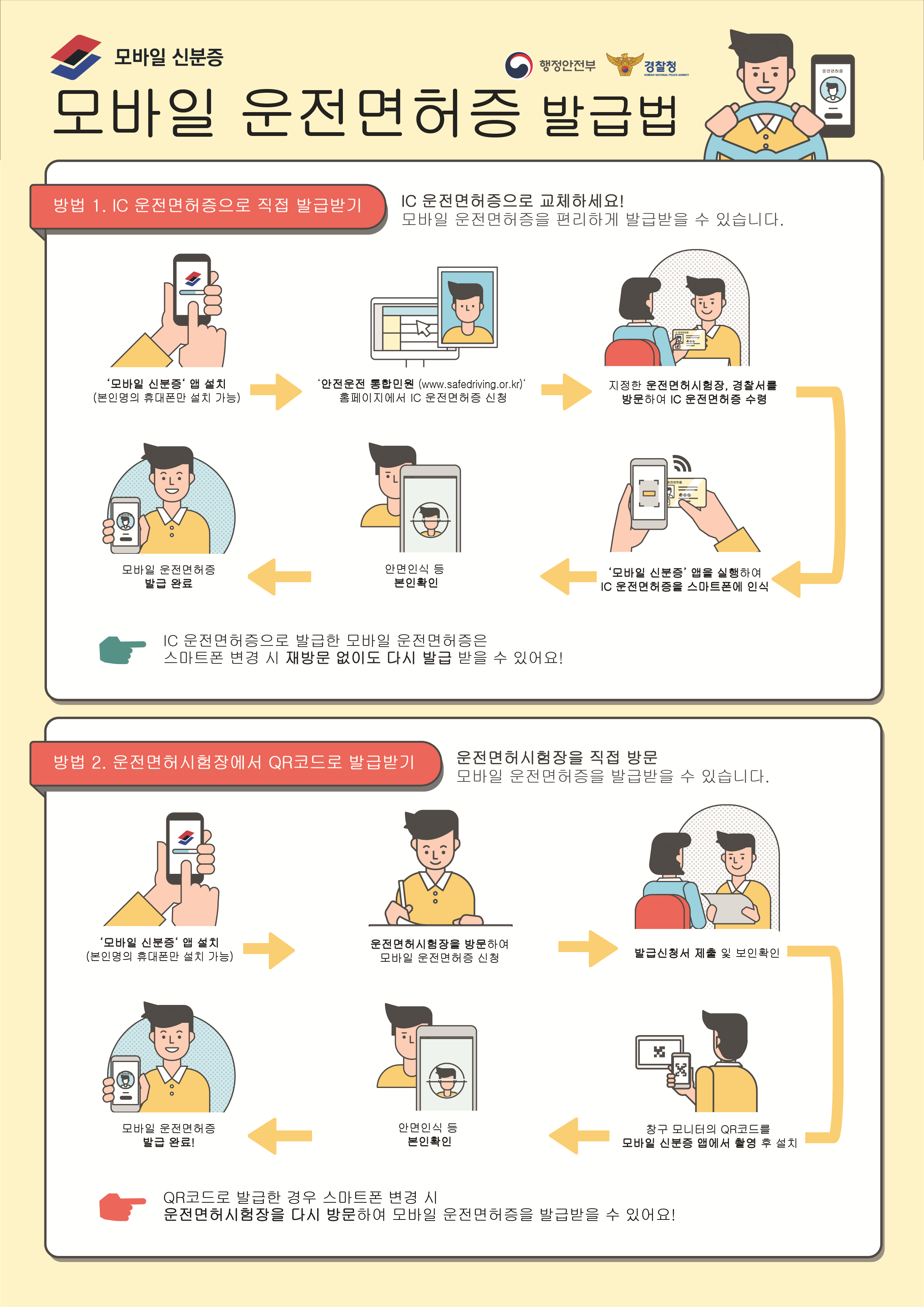 A8 휴대폰 교체 시에는 모바일 운전면허증을 다시 발급받아야 합니다. 또한, 휴대폰을 교체하지 않더라도 모바일 운전면허증의 유효기간은 3년으로서 3년이 경과하면 모바일 운전면허증을 다시 발급받아야 합니다. IC 운전면허증이 있으면 기관 방문 없이 언제, 어디서나 편리하게 모바일 운전면허증을 다시 발급받을 수 있습니다.
