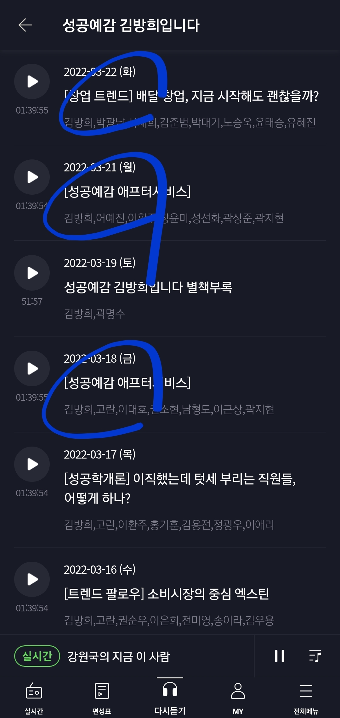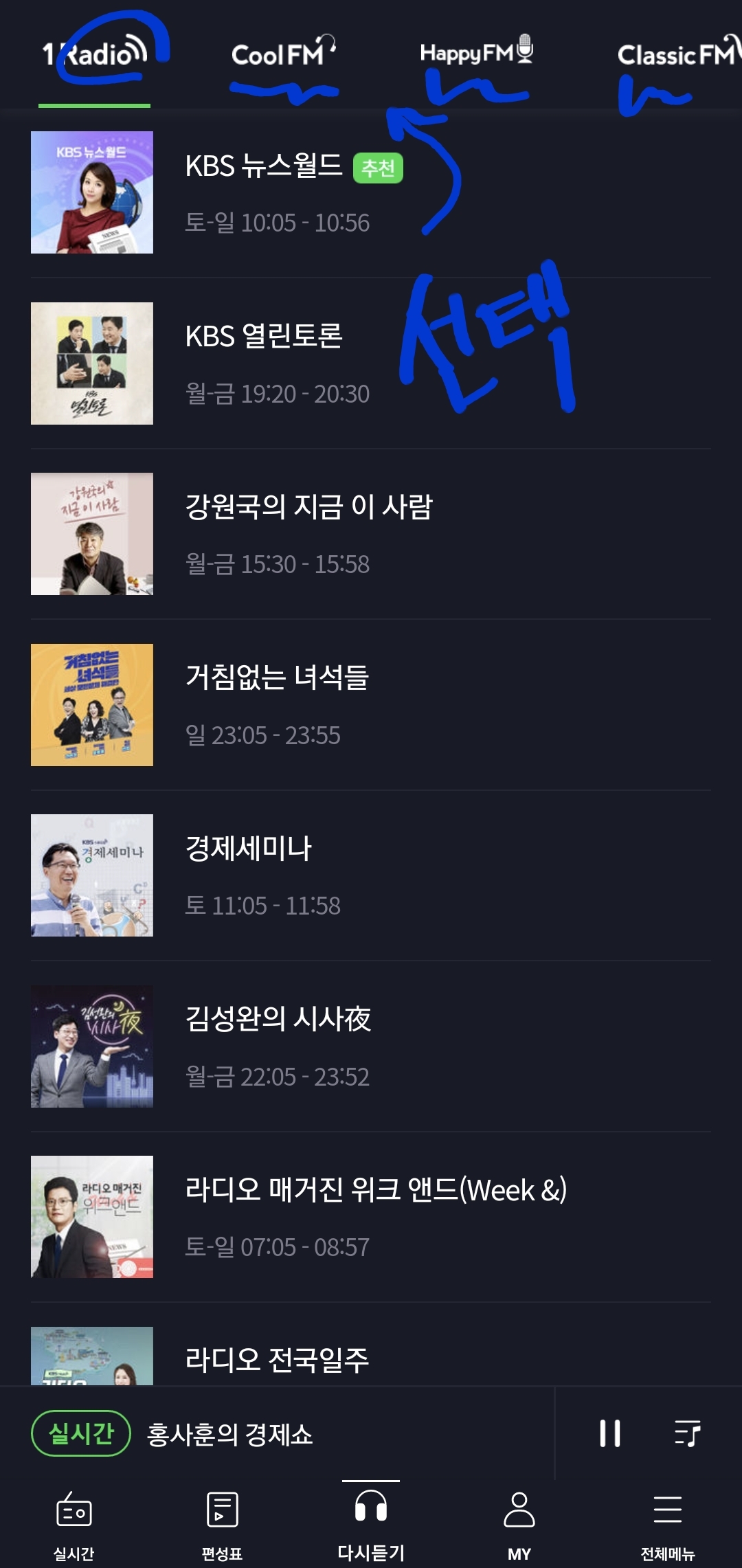 암튼 저는 이 어플에서 경제세미나, 김방회 성고예감과 같은 경제에 관한 프로그램은 "다시 듣기"로 자주 청취합니다.