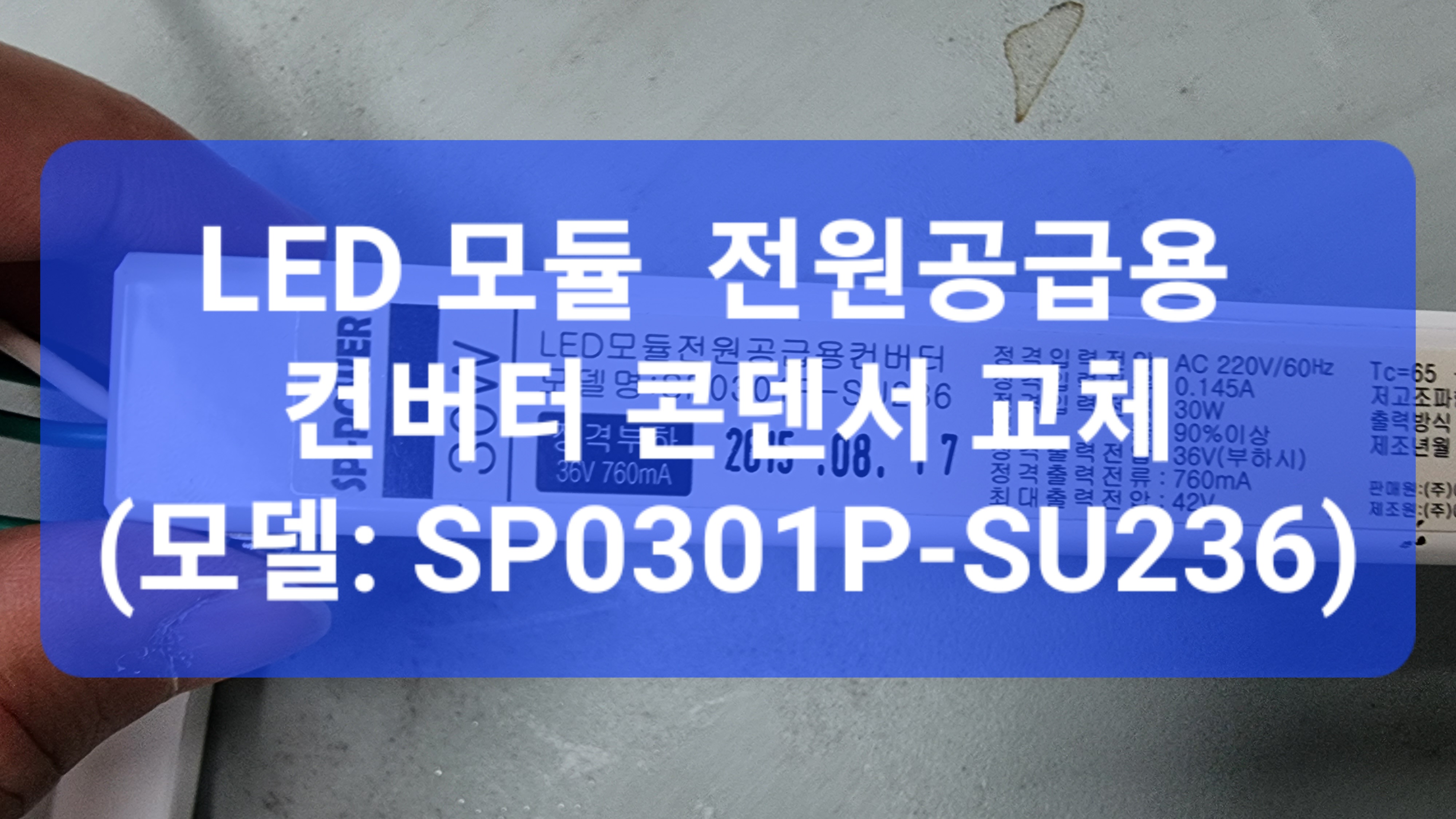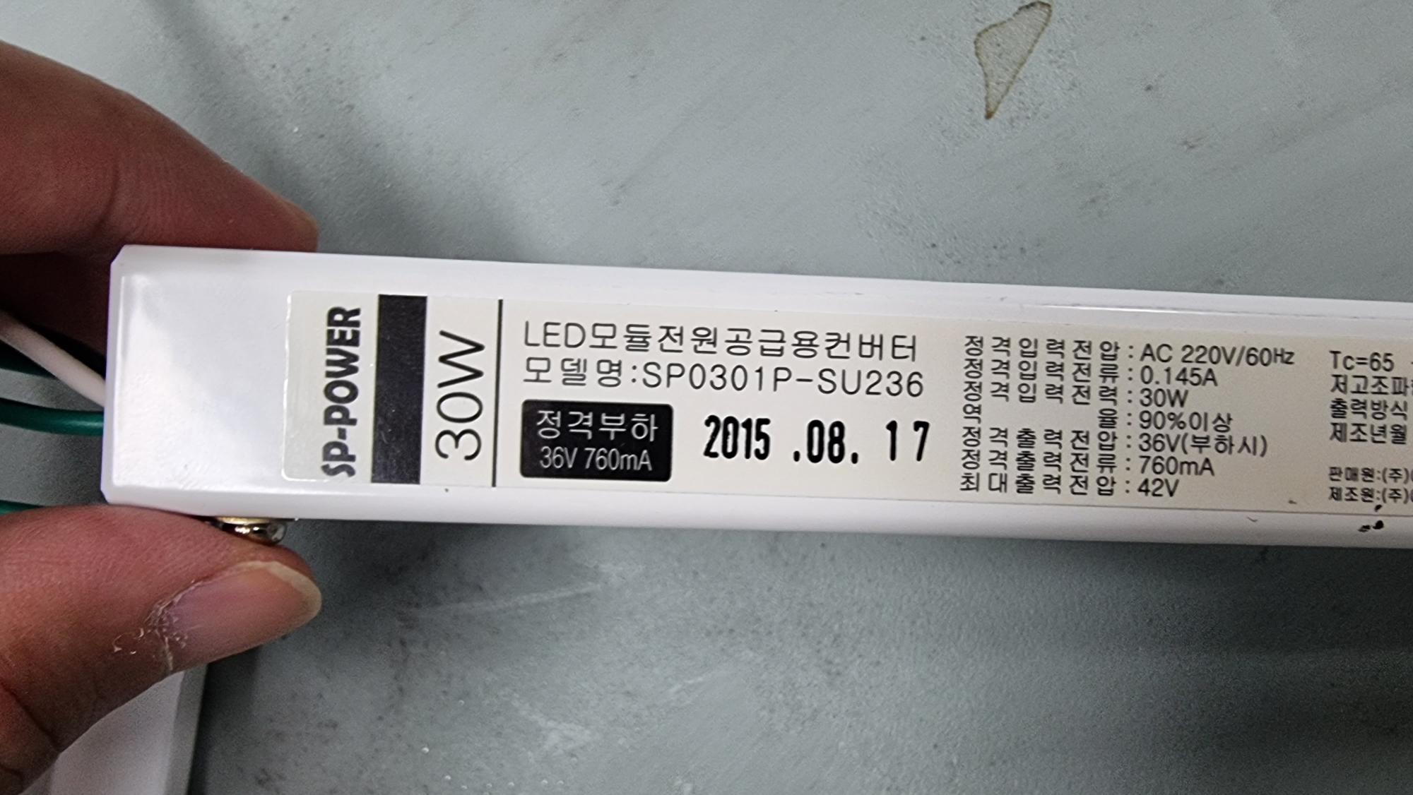 모델은 SP0301P-SU236, 정격 부하는 36V 760mA, 입력 전압은 AC220V/60Hz, 정격 출력 전압은 36V(부하 시), 최대 출력 전압은 42V이네요.