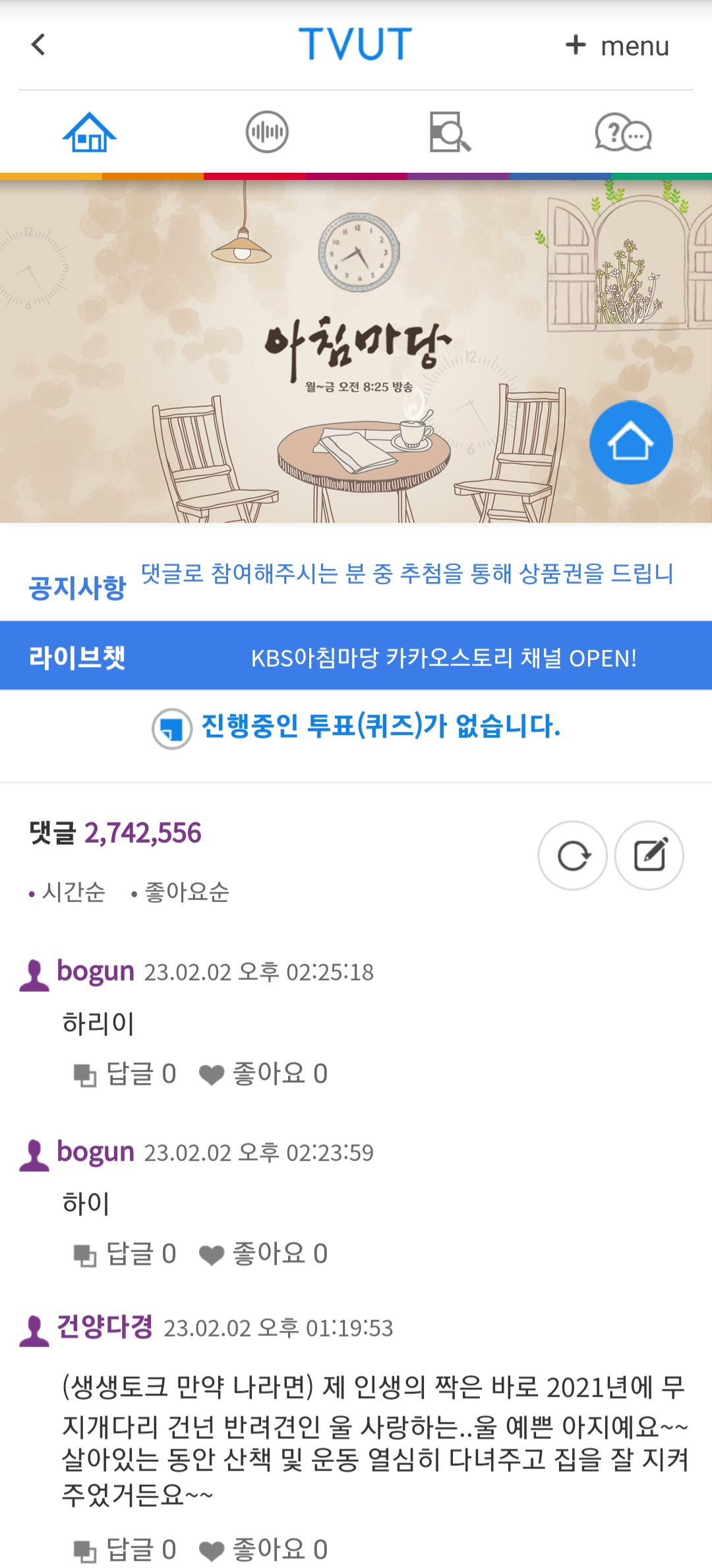 지금까지 KBS 생방송프로그램 참여 앱인 티벗으로 아침마당과 소통하는 방법에 대해 살폈는데요.