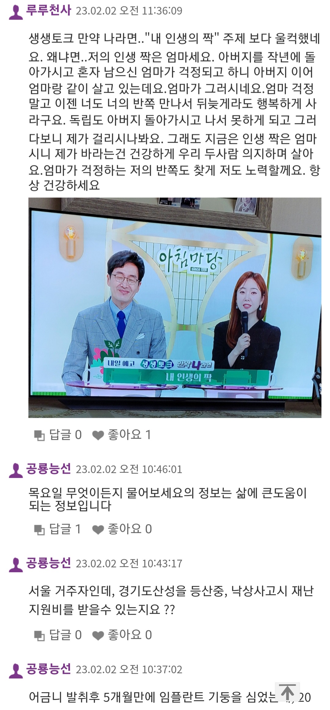 하지만 시청자 사연이나 질문 등등은 아래사진과 같이 댓글 창을 이용합니다.