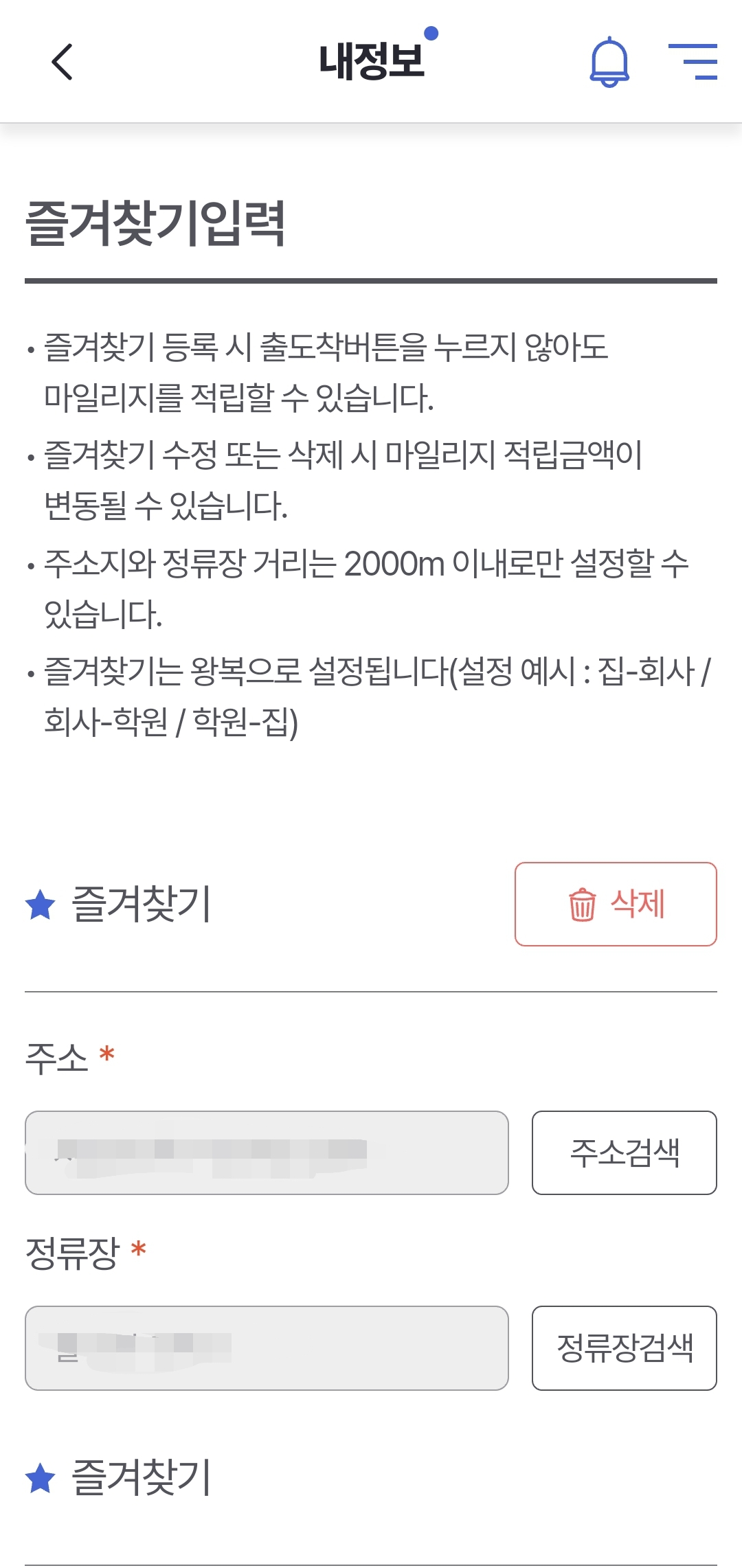 즐겨찾기는 3세트(6개)까지 등록할 수 있습니다. 집-학교, 학교-학원, 학원-집 루틴인 경우 이용하는 정류장이 동일하다면 6개를 등록하지 말고 집, 학교, 학원만 등록해도 마일리지를 적립할 수 있습니다. 학교 주변의 지하철도 이용하고 버스도 이용한다면 모두 등록해야 편하게 이용하실 수 있습니다.