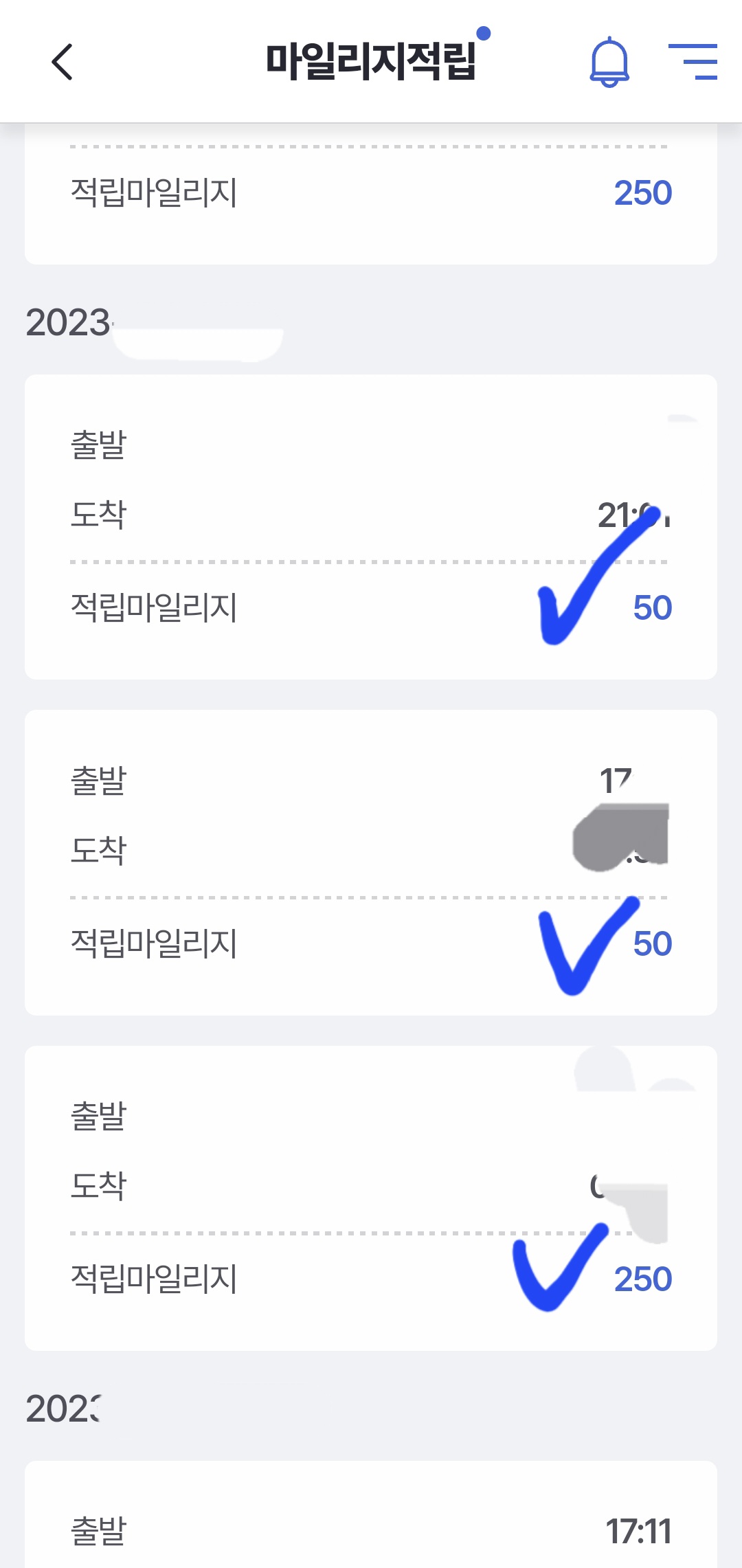 개인적으로는 마일리지 50원/250원 차이, 출발/도착을 누리지 않았는데도 마일리지가 지급된 사유 등 궁금증이 모두 해소되면서 속이 좀 후련해졌습니다.
