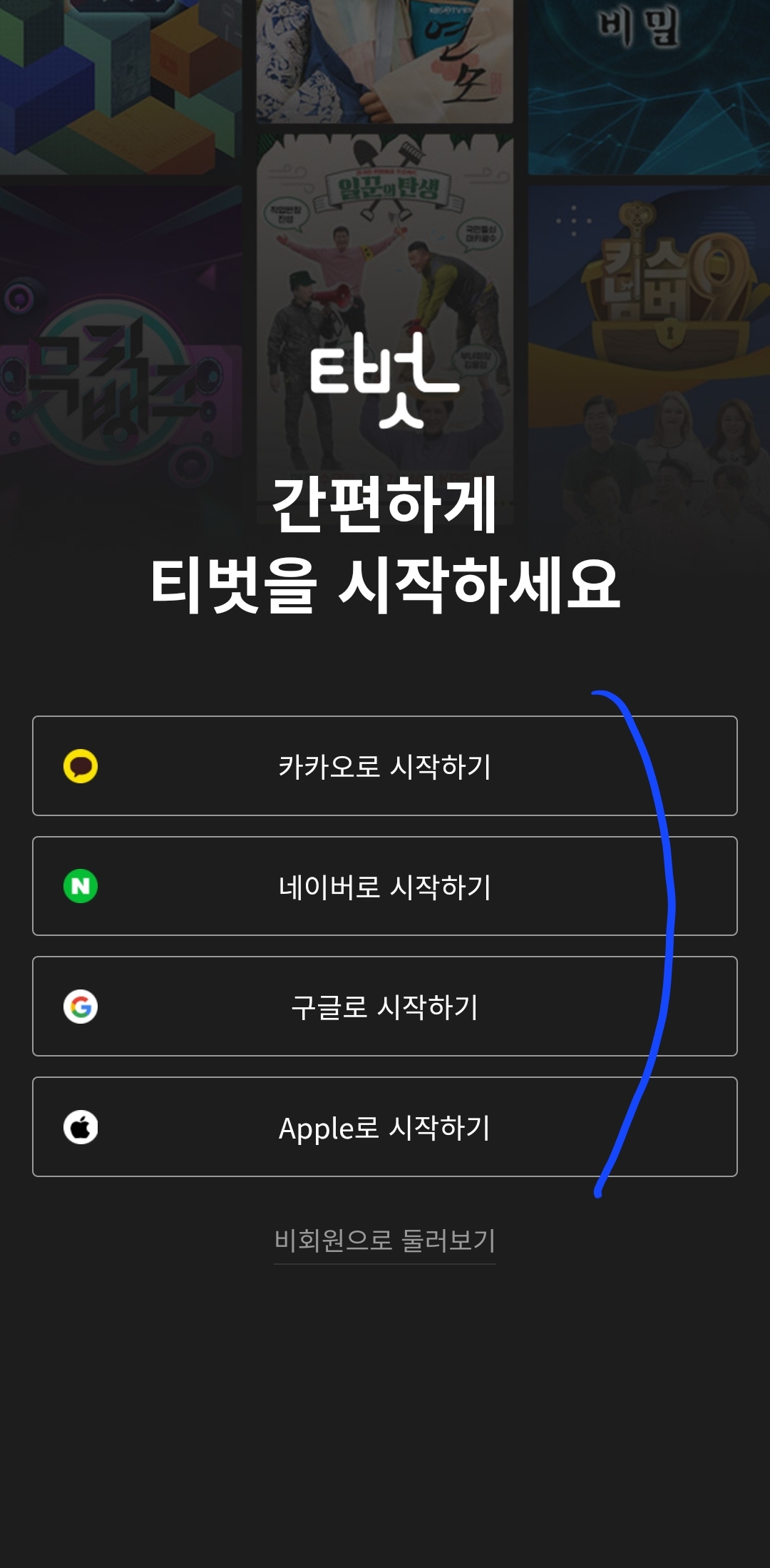 8. <티벗 간편하게 티벗을 시작하세요>라는 화면이 나오는데 로그인 방식은 카카오, 네이버, 구글, 애플 등 4가지이네요.