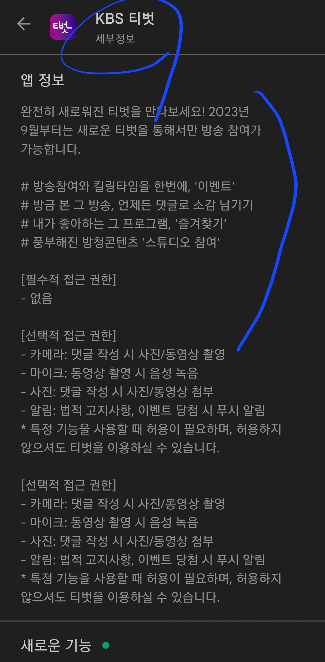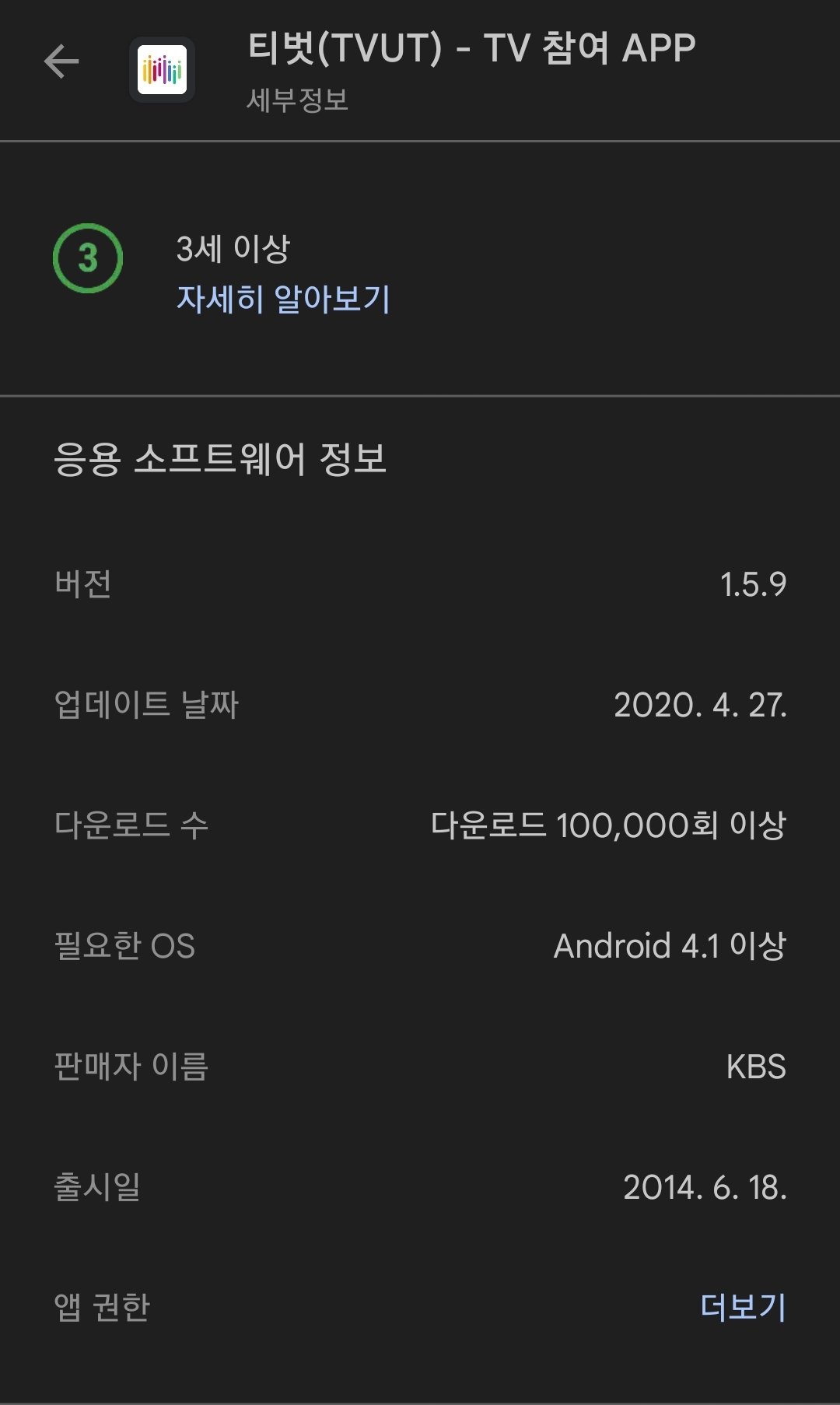 버전은 1.0.1이고 업데이트 날짜는 2013년 8월 17일, 다운로드수는 5천 회 이상(2023.8.31일 기준), 다운로드 크기는 3.79MB로 정말 가볍게 느껴집니다. 판매자 이름은 KBS로 출시일은 2023년 8월 3일로 등록되어 있네요.