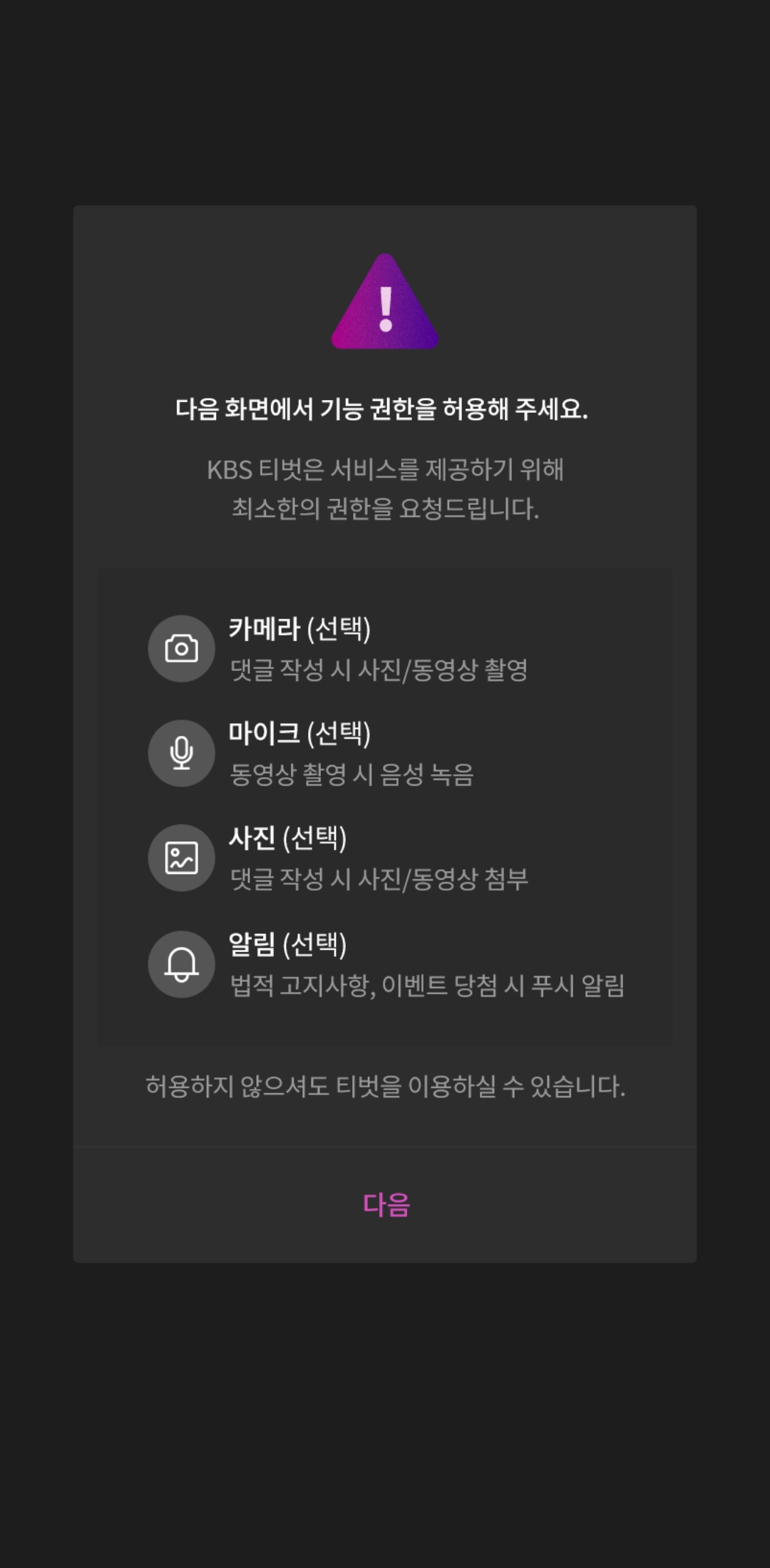 - <KBS 티벗은 서비스를 제공하기 위해 최소한의 권한을 요청드립니다.>라고 하면서 카메라, 마이크, 사진, 알림 등의 권한 요청항목이 있네요.