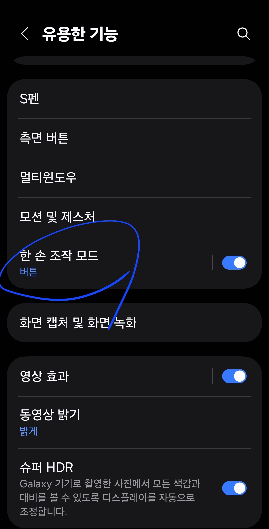 한 손 조작 모드는 화면 크기를 줄이고 위치를 조절할 수 있기 때문에, 손가락이 닿지 않아 불편했던 상단 메뉴나 버튼도 손쉽게 누를 수 있도록 도와줍니다.
