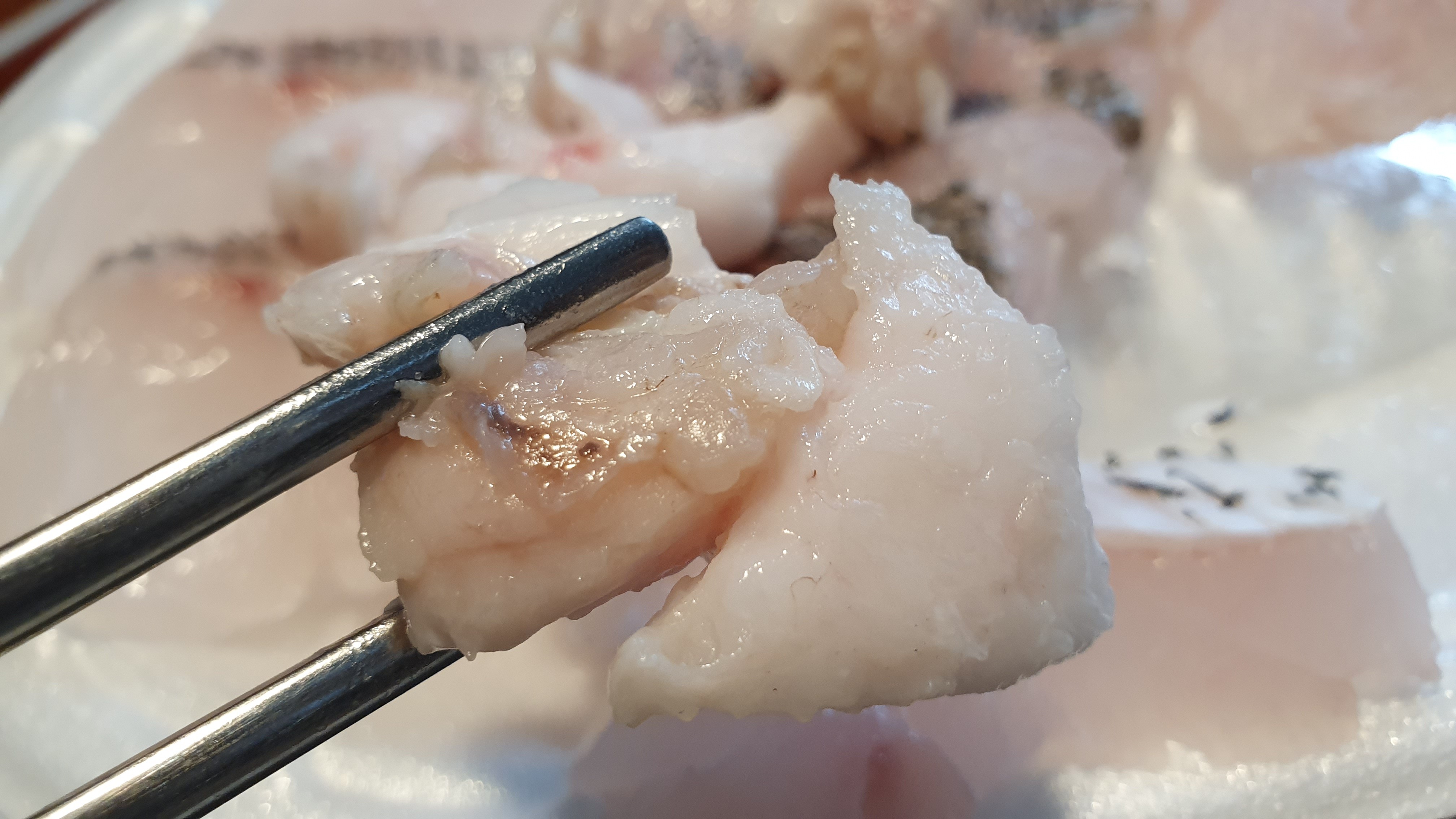 뱃살과 부레 등은 회로 먹고요. 머리와 뼈 등은 탕으로 해서 먹었습니다.