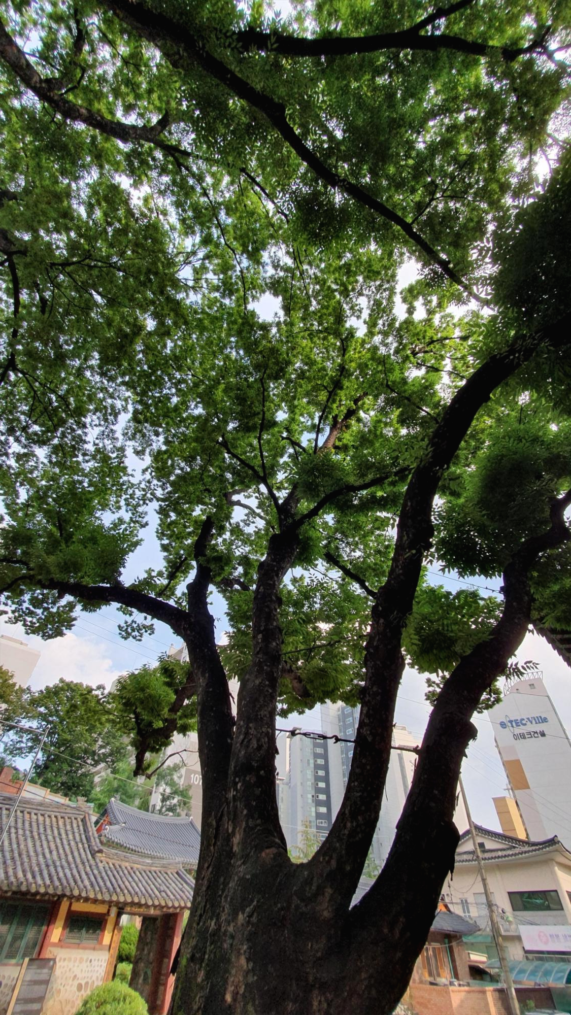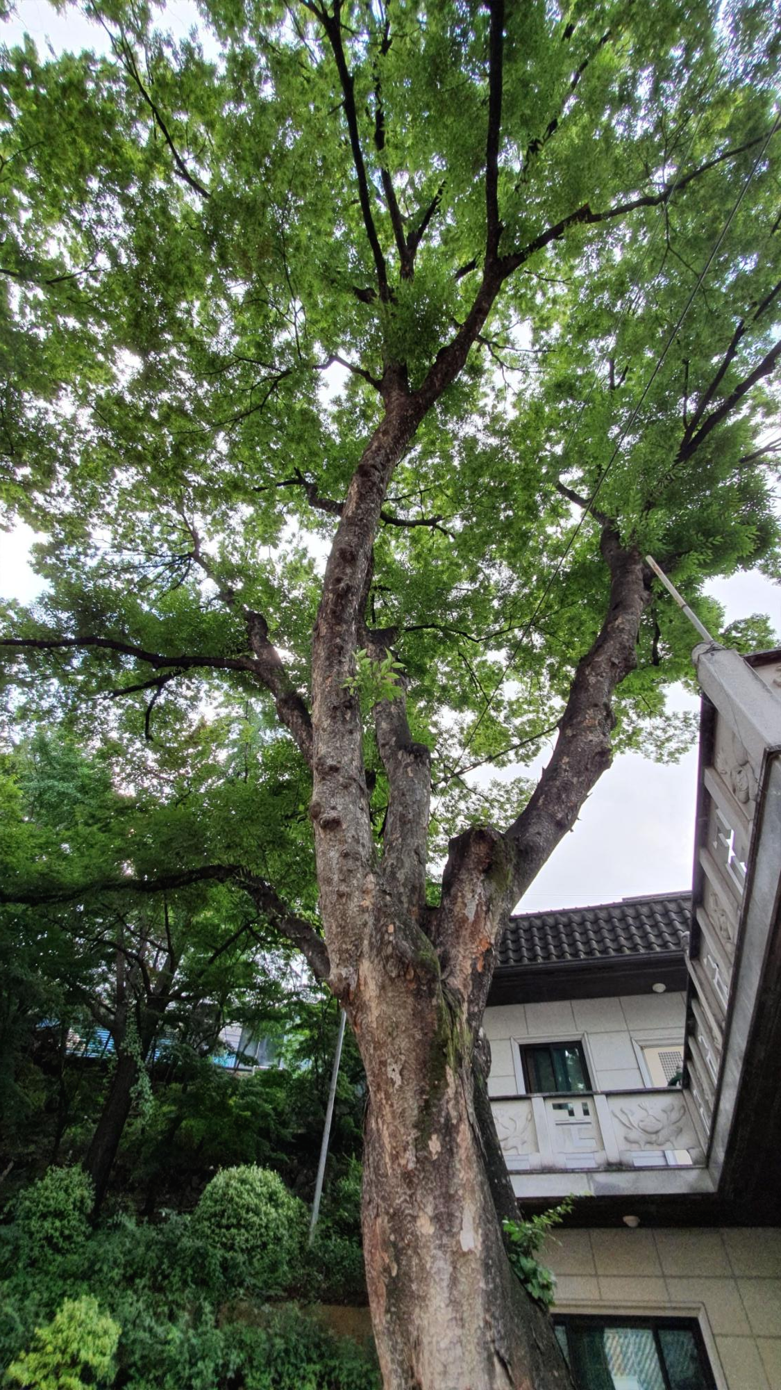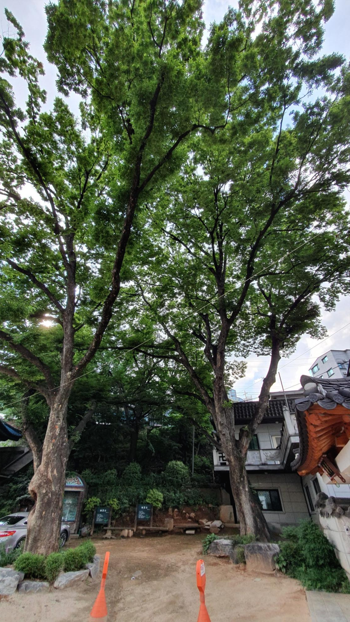 200년된 보호수 느티나무 전경입니다. 나무가 너무 커서 갤럭시S10 5G의 초광각 카메라를 이용하여 촬영했습니다. 사진이 뭔가 왜곡이 있더라고 이해해 주시기 바랍니다. 고유번호 위치로 본다면 오른쪽에 있는 나무가 고유번호 서4-6, 왼쪽이 서4-7번입니다.