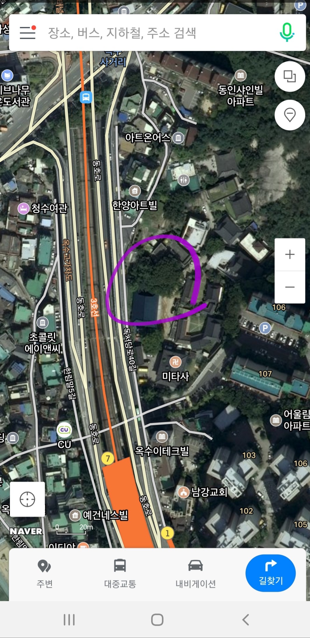 [아래사진]은 옥수역 방향에서 초광각모드가 아닌 일반모드로 촬영한 사진입니다. 보호수에서 좀 떨어진 위치에서 촬영했네요. 사진을 자세히 보니 나무가 1본인것으로 보이네요. 하지만 실제는 2본입니다.