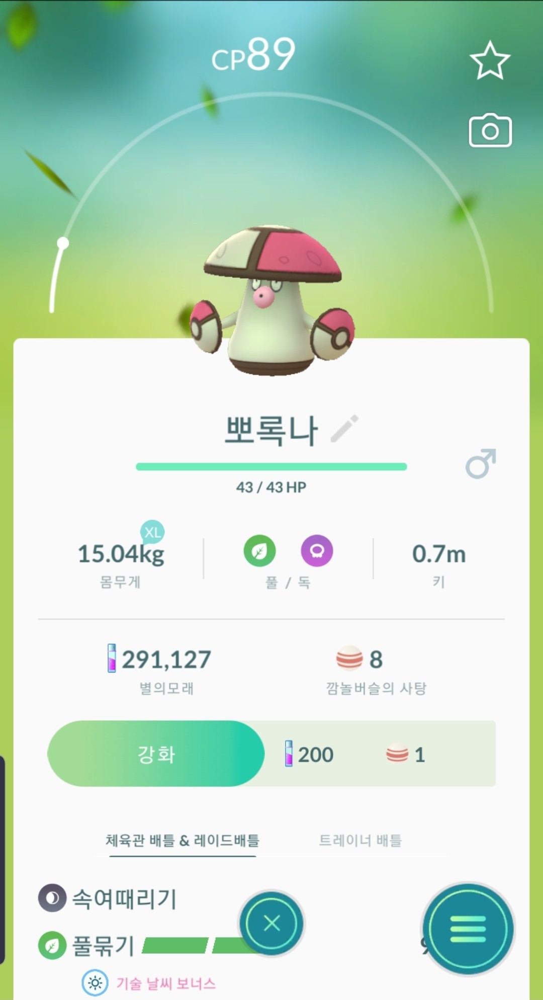[아래사진]은 도감번호 591번의 뽀록나 포켓몬입니다. 버섯포켓몬으로 분류되며, 양팔의 몬스터볼을 닮은 삿갓을 한들한들 흔들어 먹이를 유인하는 춤을 추는 특징이 있습니다.