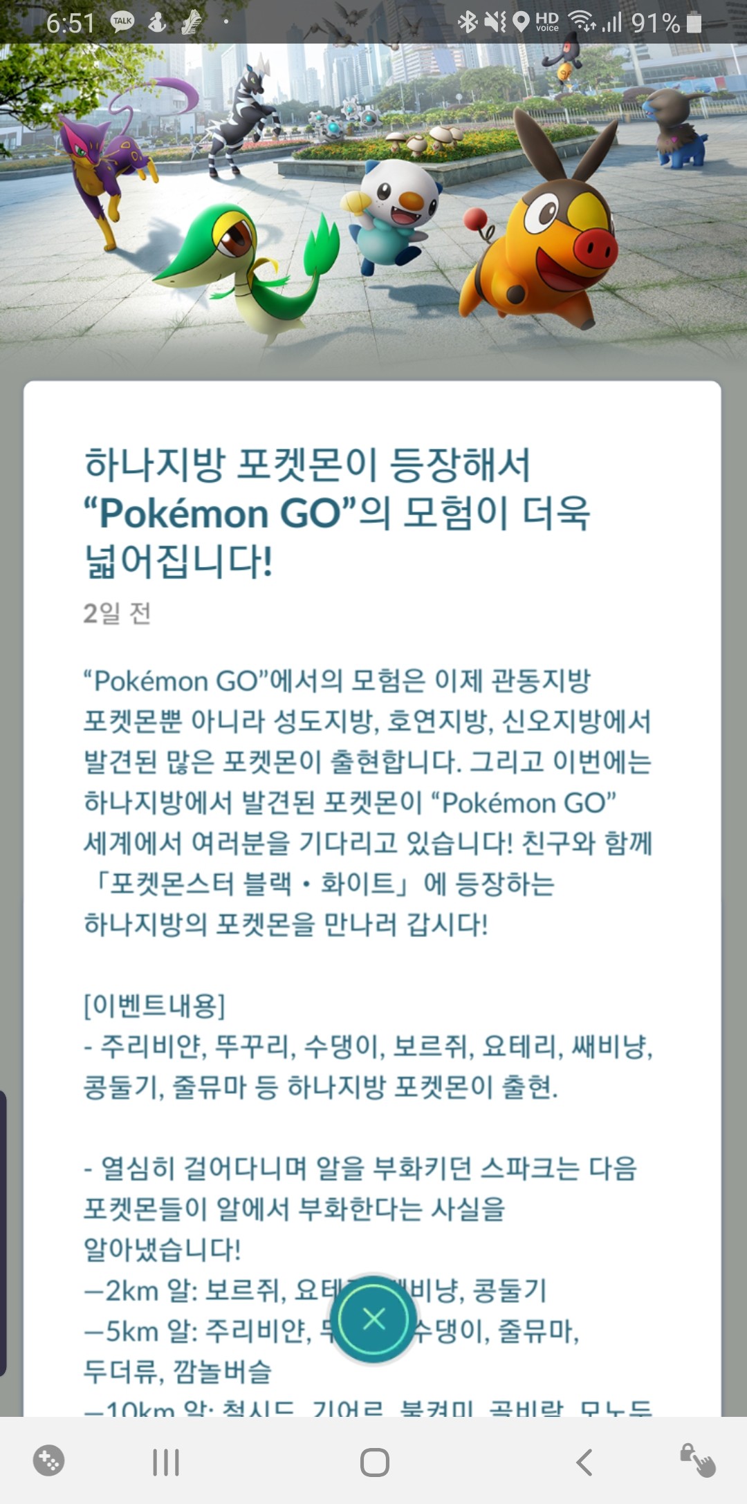 최근 포켓몬게임은 "하나지방 포켓몬이 등장해서 포켓몬고의 모험이 더욱 넓어집니다"라는 이벤트를 [아래사진]과 같이 공지했어요. 그러면서 포켓몬 게임을 열면 하나지방 포켓몬들이 자주 출몰합니다.