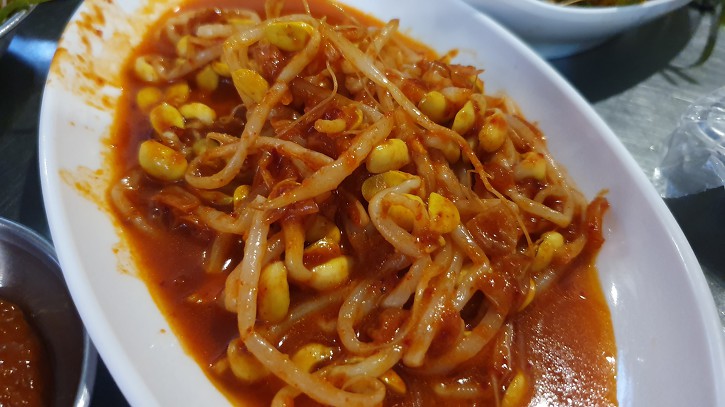 콩나물무침입니다. 불판에 익은 김치가 있어서 그런지 이 콩나물 무침에는 손이 많이 가질 않았네요.