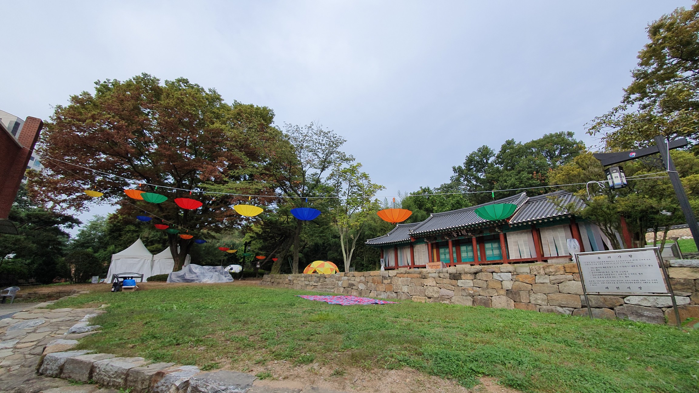 조선시대 객사였던 온온사에도 과천축제장소로 변신했더군요. 축제를 즐기려고 이곳에 일부러 간 것은 아니고요. 산책 중에 이곳 주변 단풍을 촬영하려고 올라갔는데 어떻게 축제 현장과 맞닥뜨리게 되었네요. 형형색색 우산 등이 걸려 있어 분위기가 아주 달라 보이더군요. [아래 사진]이 온온사 축제 현장 전경입니다.