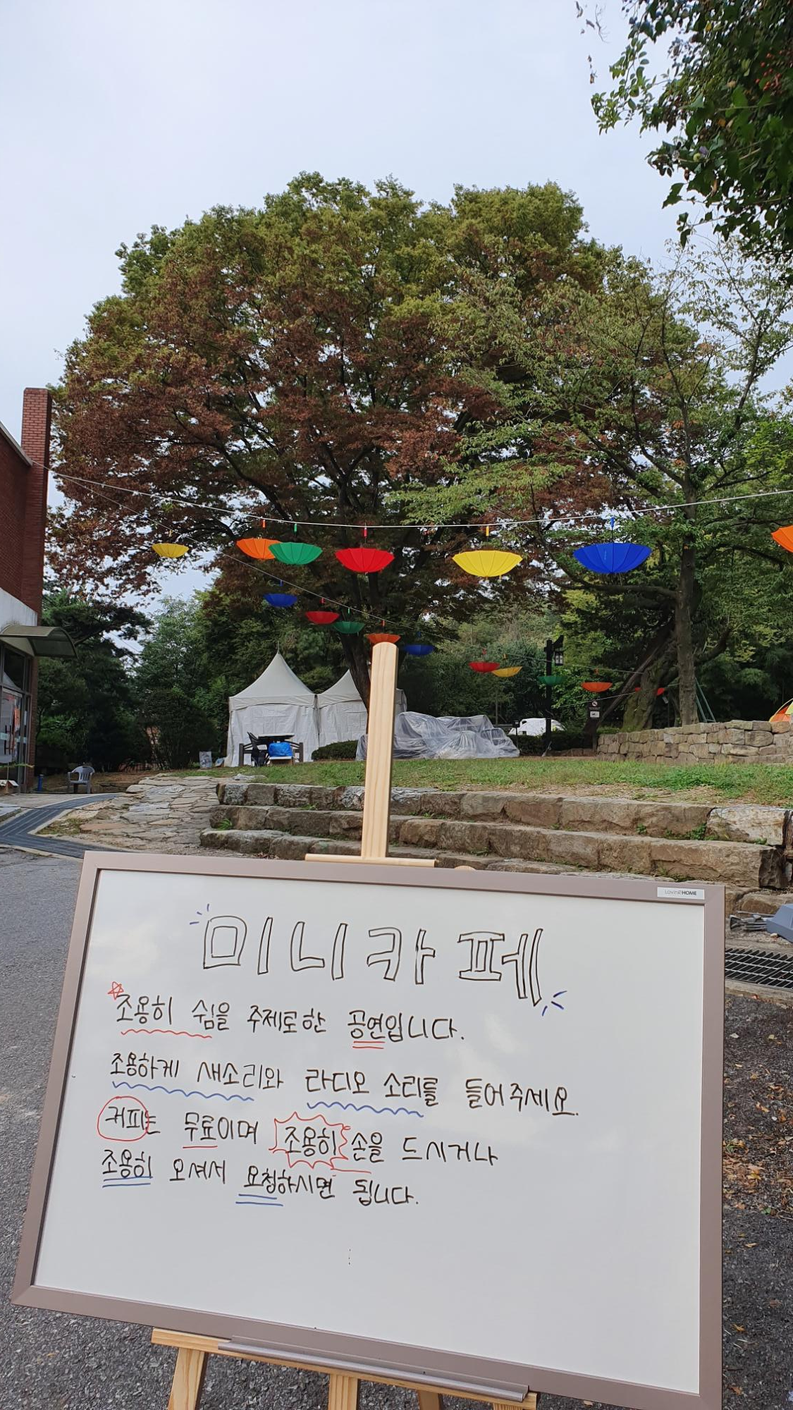 온온사를 600년 이상 지키고 있는 은행나무를 지나면 [아래 사진]과 같은 미니카페 운영에 관한 안내문이 보이네요. 제가 방문한 시간은 아침 8시경 오픈전으로 행사 관계자들이 아무도 보이지 않더군요. 미니카페 안내문 전문을 아래에 옮겼습니다.