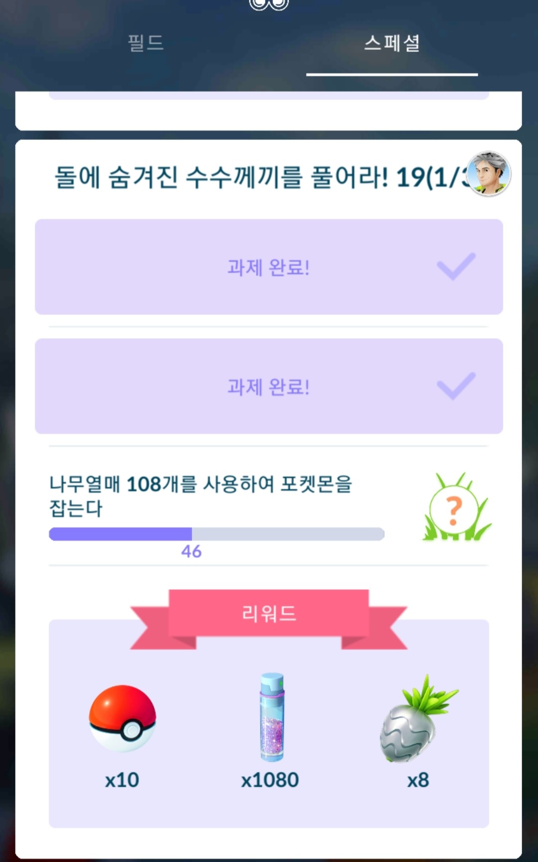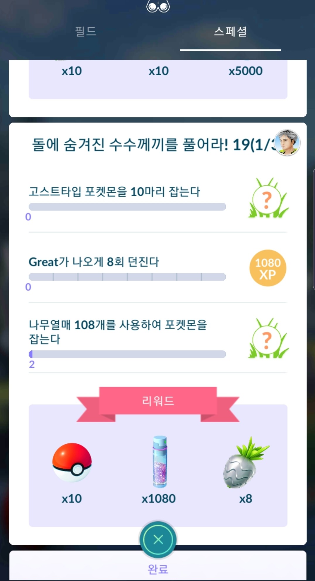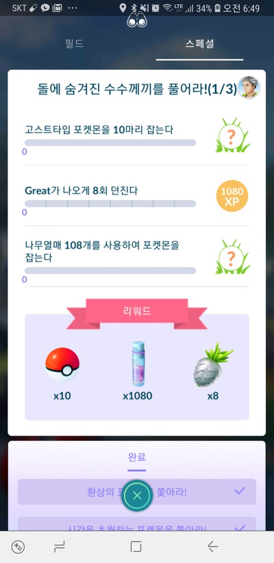 방금전에 "돌에 숨겨진 수수께끼를 풀어라" 리서치 중 "고스트타입 포켓몬을 10마리 잡는다."와 "그레이트가 나오게 8회 던진다."을 클리어 했는데요.