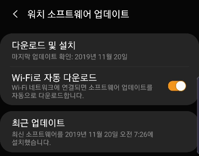 워치 소프트웨어 업데이트를 완료하면 "최신 소프트웨어를 2019년 11월 20일 오전 7시 26에 설치했습니다."라는 메시지가 보입니다.