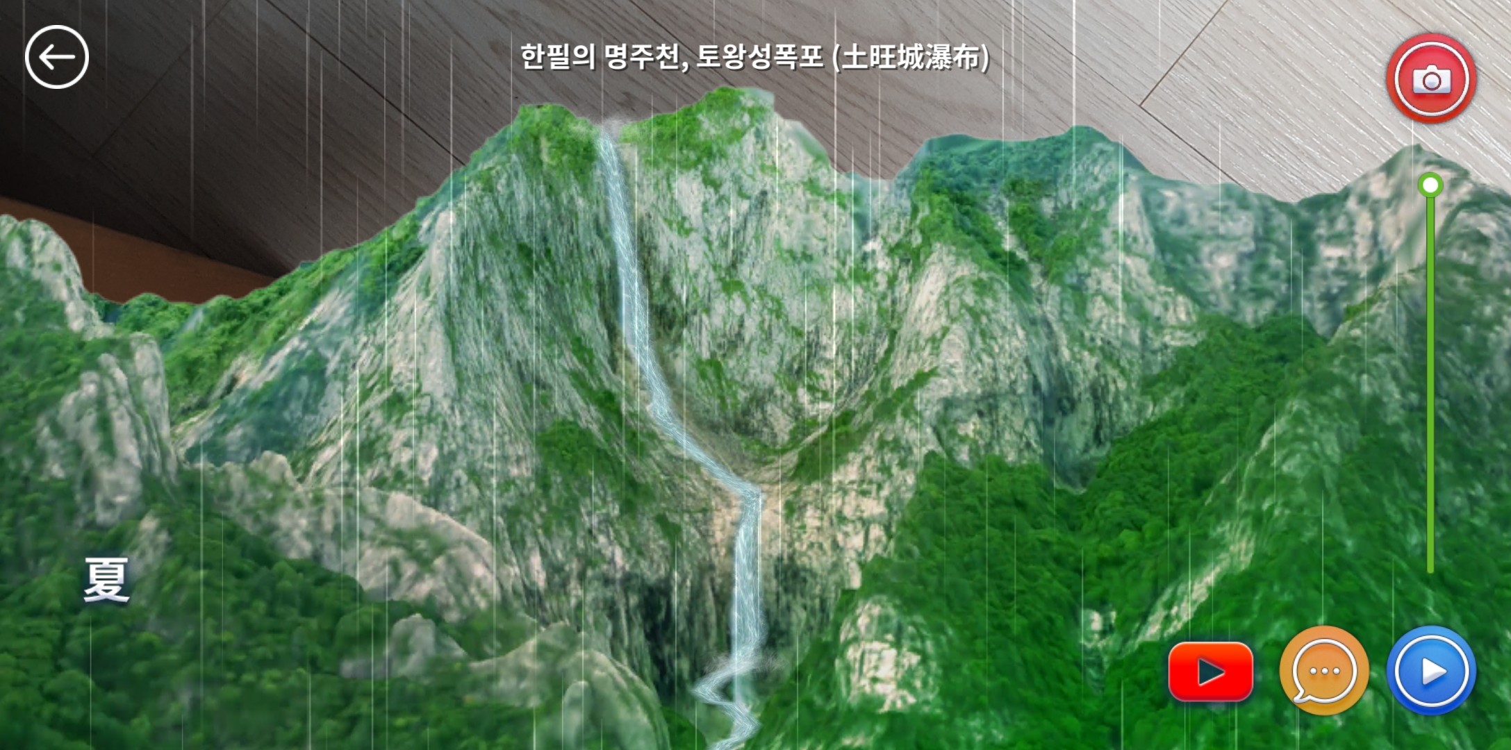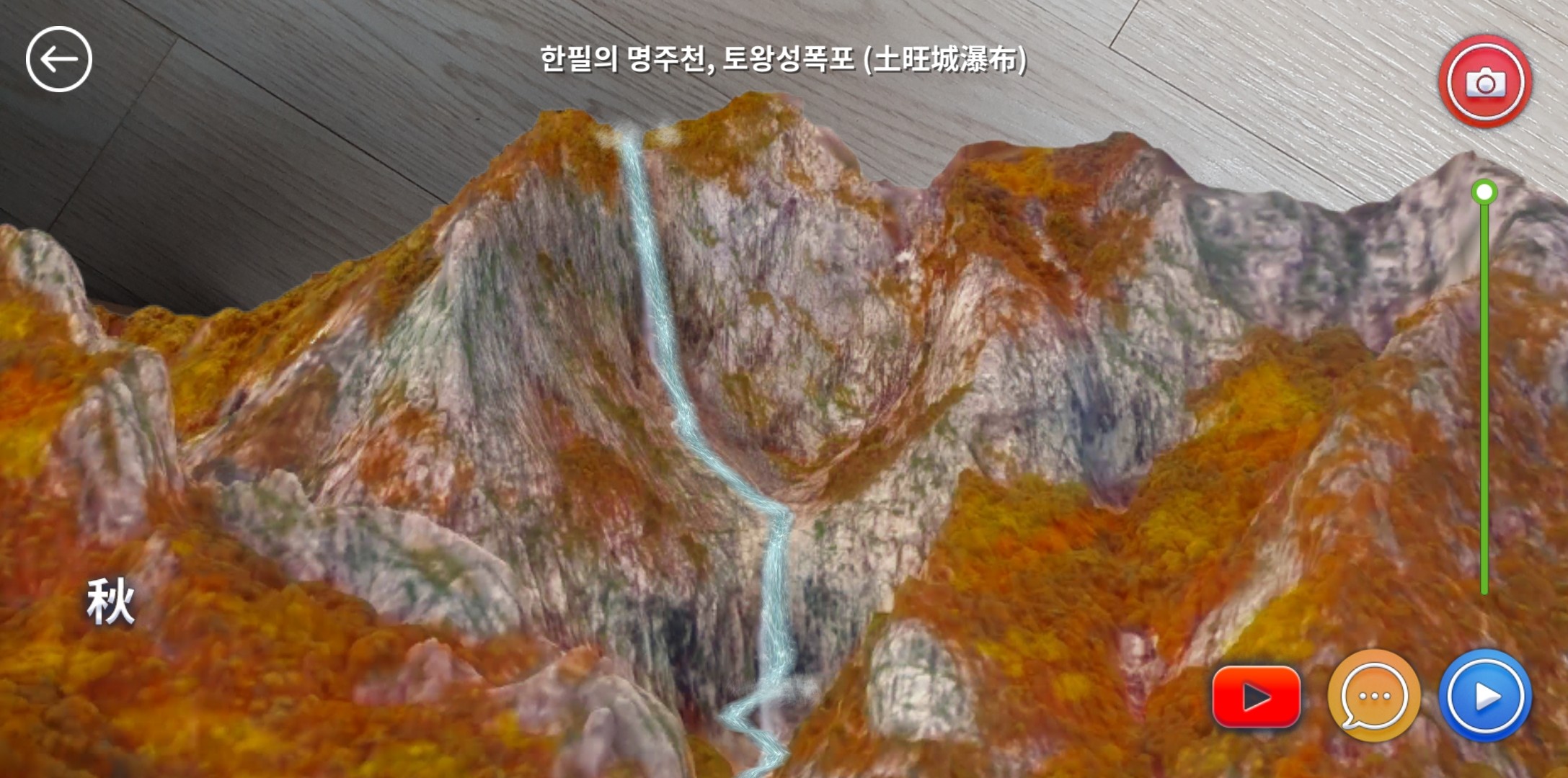 설악산 토왕성폭포는 수량이 적어 평소에는 흐르지 않는 폭포를 웅장하게 떨어지는 물줄기와 함께 아름다운 사계절의 모습으로 [아래 사진]과 같이 구현했더군요.