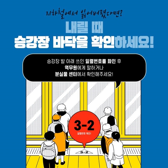 승강장 발아래 쓰인 일렬 번호를 확인 후 역무원에게 말하거나 분실물 센터에서 확인해주세요.