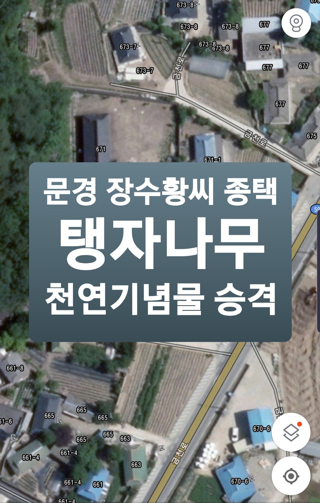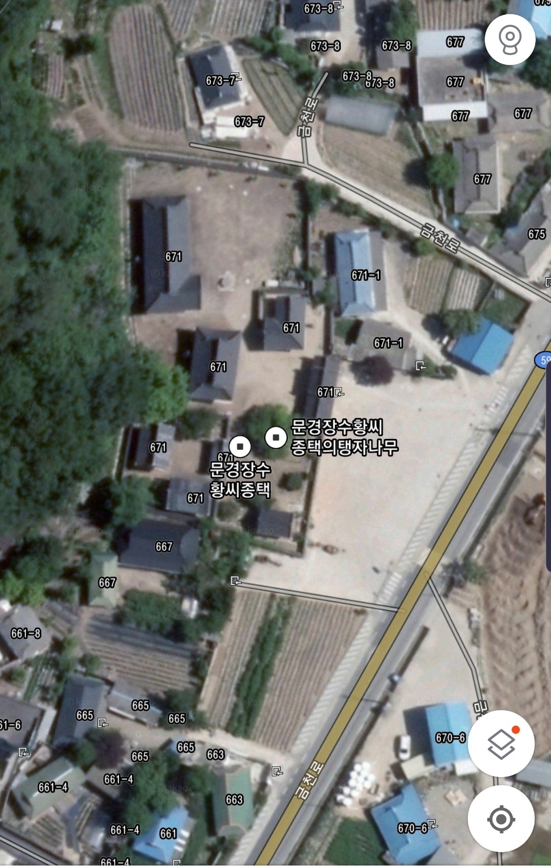 제가 문경 장수황씨 종택을 가보질 못했습니다만 대신 카카오맵 위성사진으로 그 주변을 살폈는데요. 오늘 소개하는 탱자나무가 [아래캡처자료]에서 보는 것 처럼 종택 앞마당에 자리잡고 있네요.