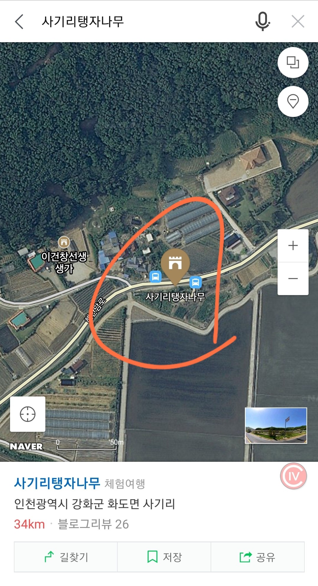 [아래 사진]은 이 나무가 있는 위성사진인데요. 주소는 강화군 화도면 사기리 해안남로에 아주 가깝게 붙어 있습니다. 주변에는 이건창 선생 생가가 있더군요. 주차는 녹록지가 않습니다. 다만 이건창 선생 생가 주변에 1-2대 정도의 공간이 있습니다.