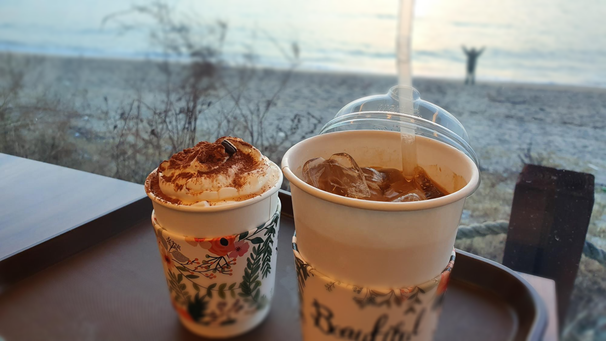 커피 마시면서 노을이 지고 있는 해변을 배경으로 우리가 주문한 것들을 카메라에 담아봅니다.