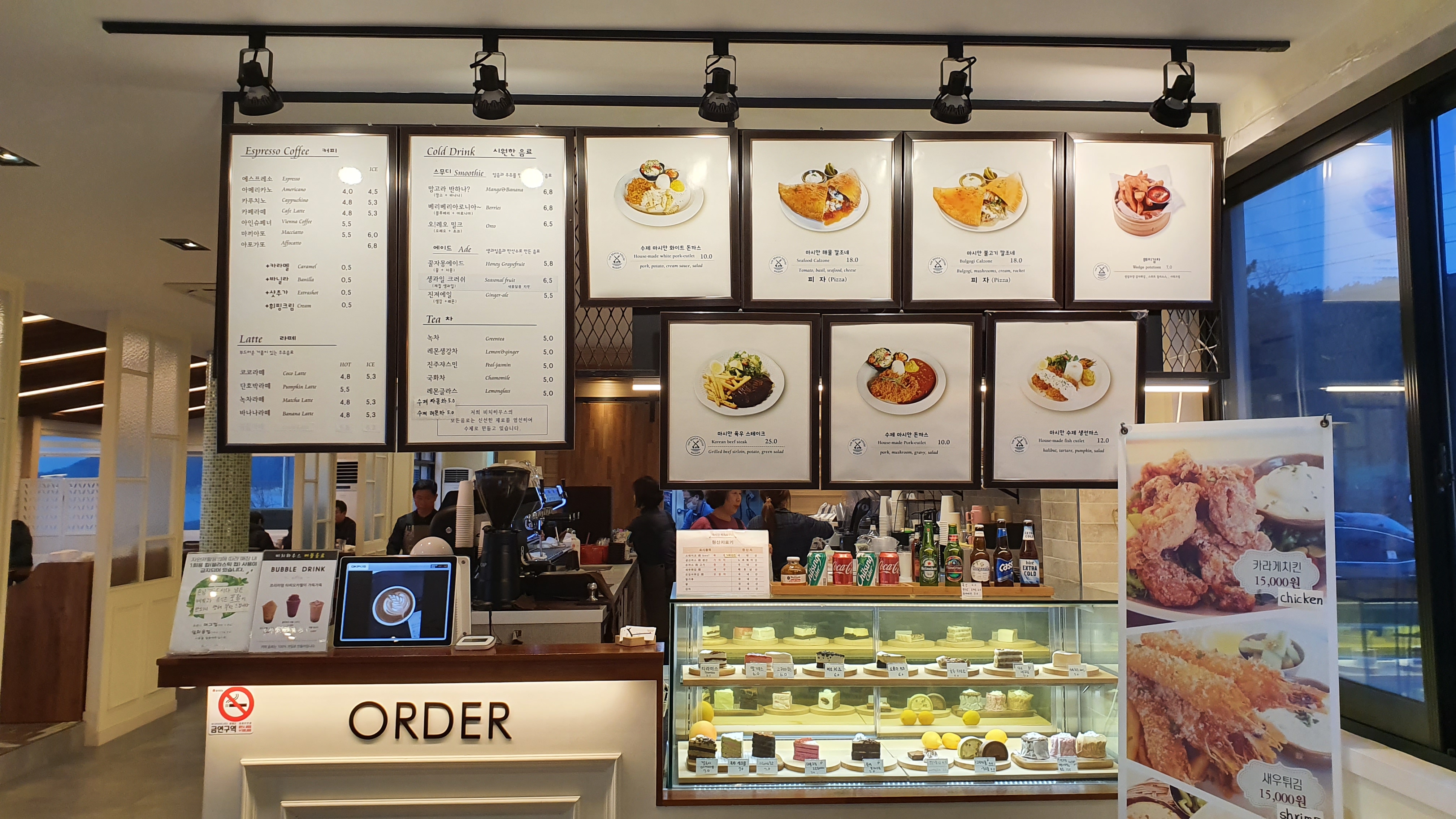 커피, 라떼, 시원한 음료, 차, 수제돈까스, 피자 등 다양하게 준비되어 있네요. 울 일행은 아인슈페너(5.5k), 아이스 카페라떼(5.3k)를 주문했습니다. 참고로 이곳의 돈까스 맛도 범상치 않다고 하는데요. 인근에 있는 해물칼국수에 밀렸답니다.