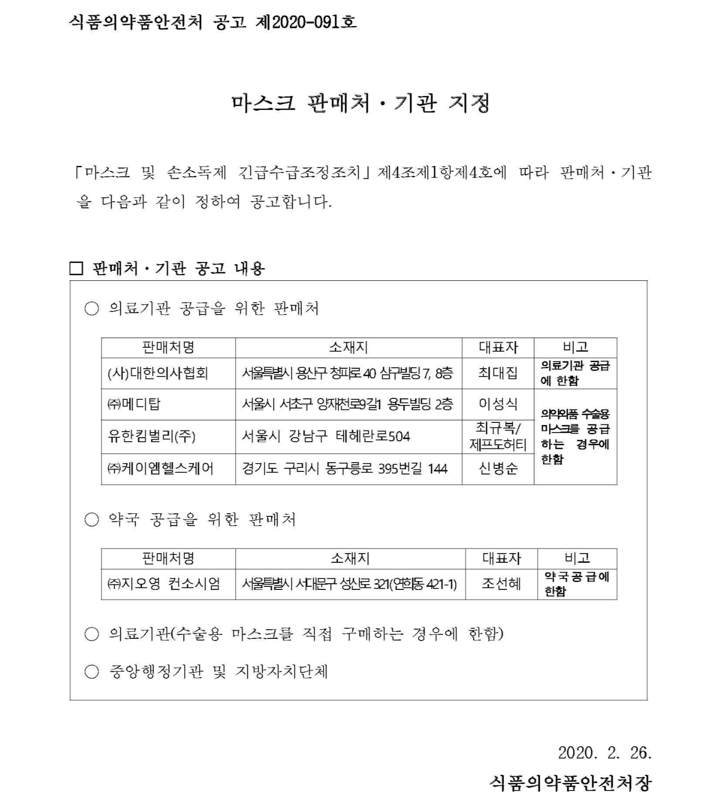 식품의약품안전처는 26일 마스크 판매처와 기관을 [아래 사진]과 같이 지정하여 공고했습니다. 공고번호는 [식품의약품 안전처 공고 제2020-091호]입니다.