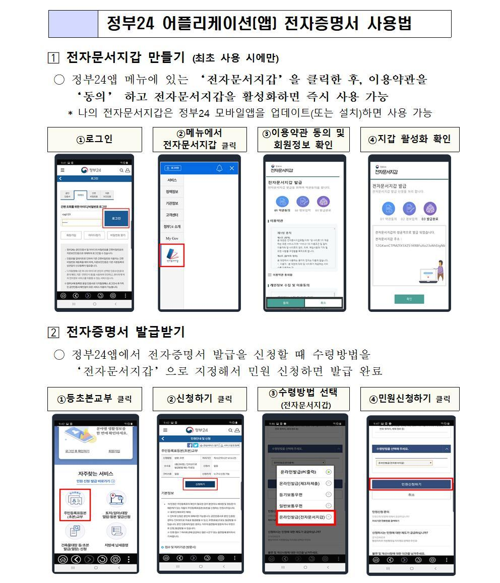 전자증명서 발급을 원하면 먼저 정부24앱에 전자문서지갑을 설치하면 됩니다. 이어 정부24앱에서 증명서 수령방법을 ‘전자문서지갑’으로 선택하고 발급을 신청하면 전자증명서를 스마트폰에 발급받을 수 있습니다.
