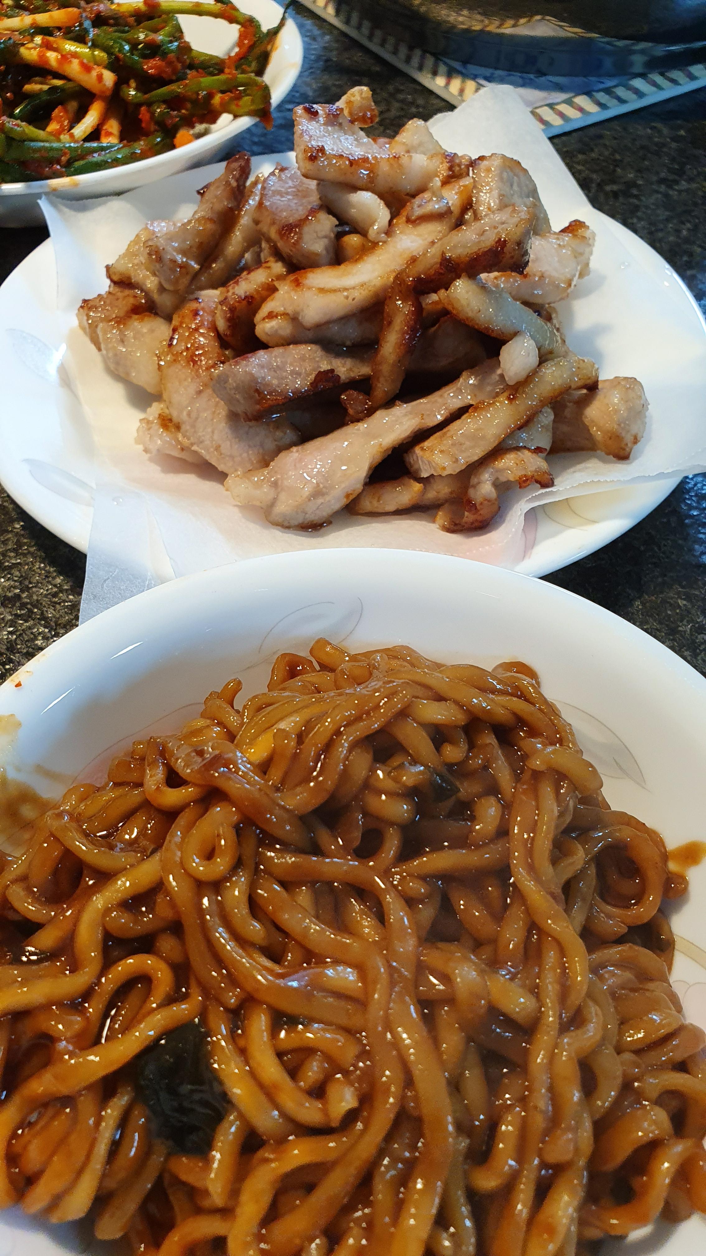 지난 토요일 저녁, 근무 마치고 집에 들어가니 울 집은 기생충에서 유명세를 탄 "짜파구리"를 만드느라 아주 분주하더군요. 울 마누라님은 항정살을 굽고, 딸은 짜파게티 만들고 있더군요. 저는 광속으로 손 씻기 하고 [아래 사진]에 나오는 모든 것을 촬영했습니다.