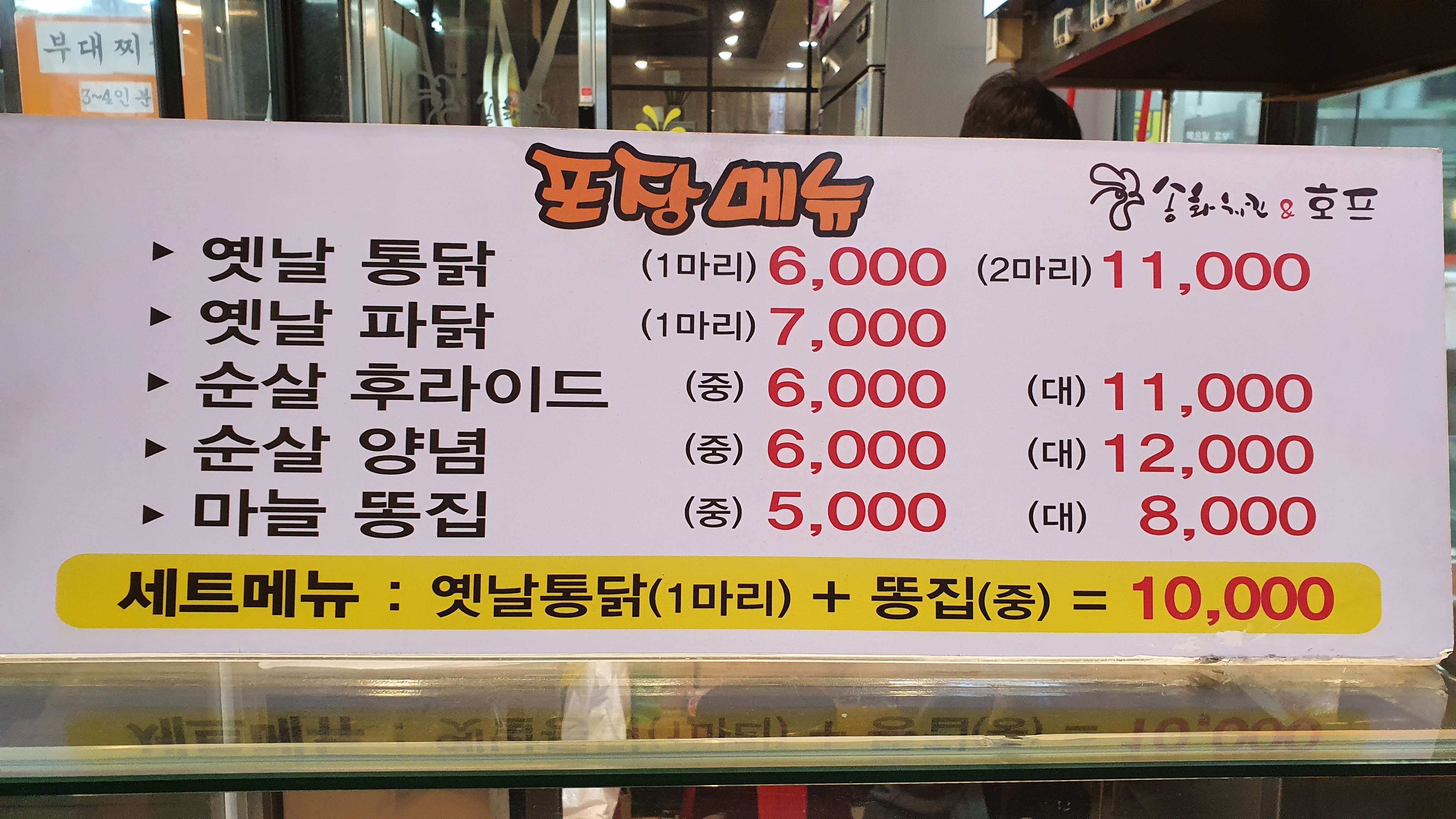 이 차림표를 보기만 해도 그냥 고향에 온듯한 냄새가 납니다. 그리고 가성비가 좋아서 그런지 마음도 편안해지는 그런 느낌도 들지요. 옛날통닭 6,000, 2마리 1만 1,000원입니다. 콜라도 개당 1,000원씩 파는데요. 이거 먹으면서 콜라가 빠질 수 없지요. 저는 옛날통닭 2마리 주문합니다.