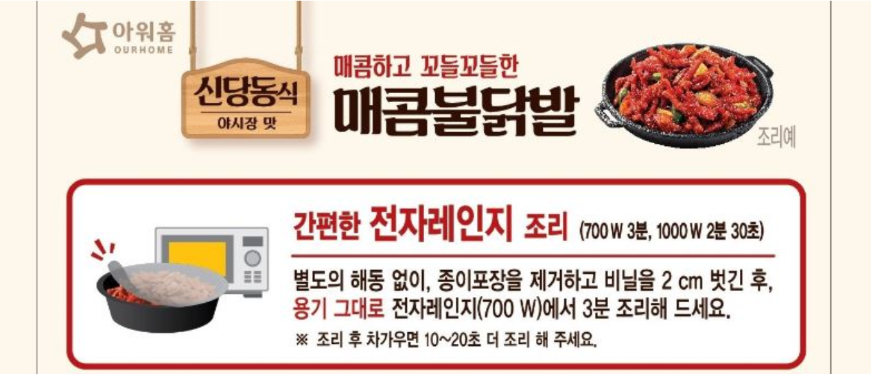 배달음식 아워홈 매콤 불닭발 메뉴얼에은 이 요리법에 대해 "별도의 해동 없이 종이포장을 제거하고 비닐을 2cm 벗긴 후, 용기 그대로 전자레인지(700w 기준)에서 3분 조리해 드세요."라고 [아래 사진]과 같이 알려주고 있습니다. 참고로 전자레인지 용량이 1kw일 경우에는 요리시간은 2분 30초로 700w에 비해 30초가 짧습니다.