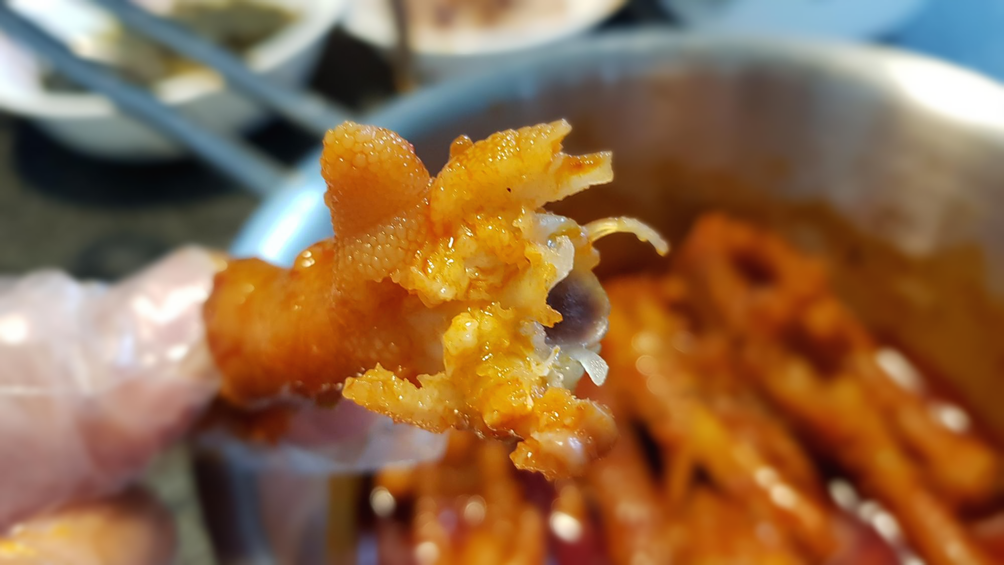 [아래 사진]과 같이 매콤닭발 하나 잡아 발가락 부위 전체를 입안에 넣어 초토화를 시킵니다. 그러면 입안에서 퍼지는 그 매운맛이 "코로나블루"를 싹 날려 버리면서 해탈의 순간이 보인답니다.