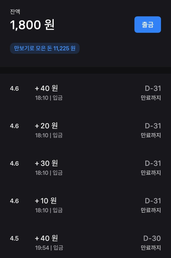 4월 7일 오전 기준으로 현재 토스 만보기로 모은 돈은 [아래사진]과 같이 11,225원입니다. 지난 2월 6,275원에 비해 약 5,000원 정도가 늘었네요. 이것은 캐시 워크와 다르게 현금으로 코로나 19 진정되면 스타벅스가서 커피 한잔 해야겠어요.