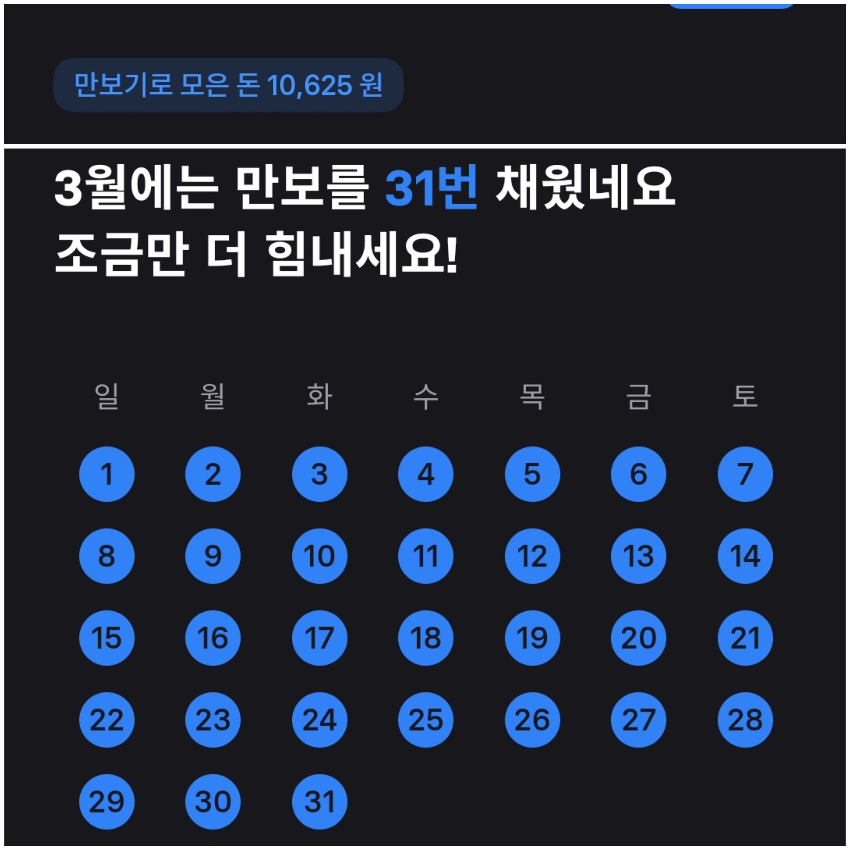 저는 하루 1만보 생활자입니다. 그래서 몇 정거장 전에 내려 출퇴근 등 좀 부지런 떨면 그렇게 어렵지가 않더군요. 이러한 결과는 [아래 사진]과 같이 토스 만보기 기준, 3월 한 달 1만보를 꽉 채웠습니다.
