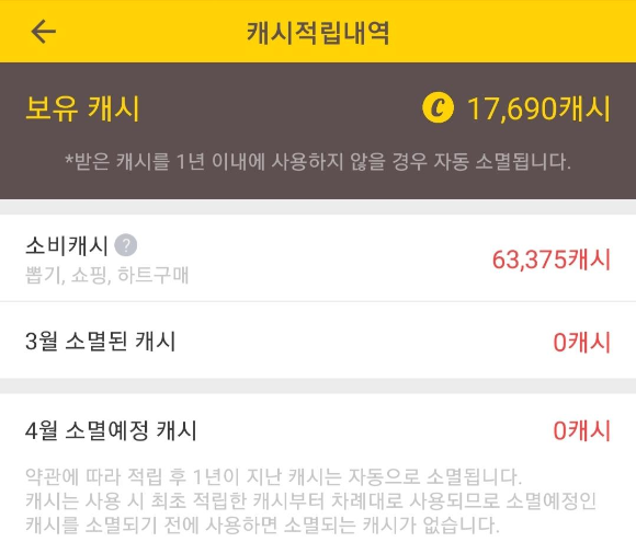약관에 따라 적립 후 1년이 지난 캐시는 자동으로 소멸됩니다. 캐시는 사용 시 최초 적립한 캐시부터 차례대로 사용되므로 소멸 예정인 캐시를 소멸되기 전에 사용하면 소멸되는 캐시가 없습니다.
