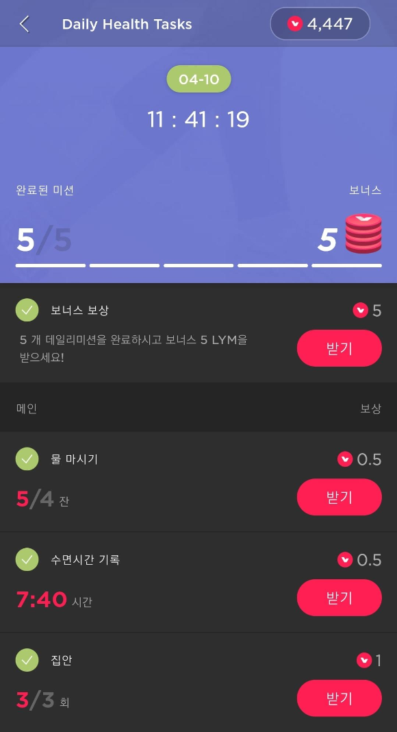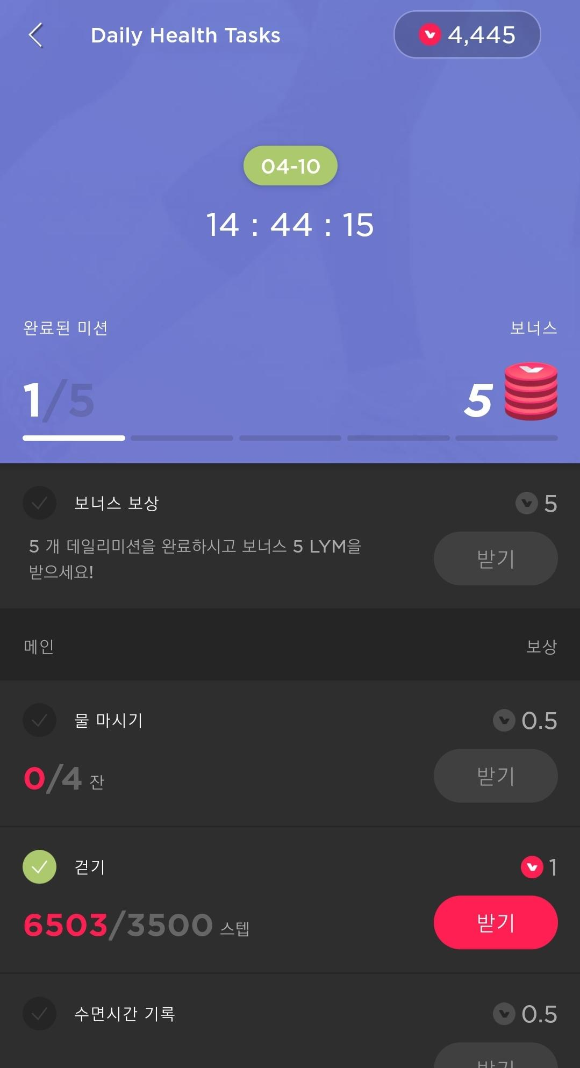 물 마시기, 환기, 걷기, 수면시간 기록 등 개별 미션을 수행하면 각각 림포 토큰 0.5 - 1개가 보상으로 주어집니다. 미션 수행이 완료되면 [아래 사진]과 같이 "받기" 부분이 적색으로 변하고 이것을 클릭하면 보상이 주어집니다.