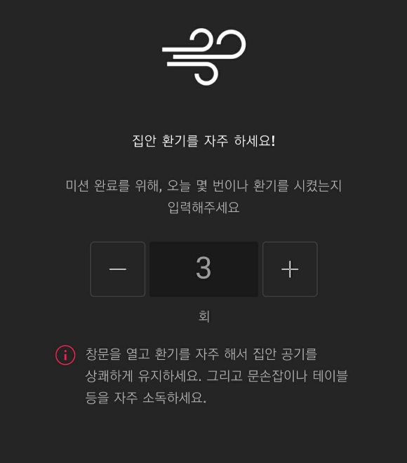 위 데일리 건강 미션에서 "집안 환기"를 클릭하면 [아래 사진]과 같은 창이 뜨는데요. 이곳에 집안홧기 시킨 횟수를 입력하면 미션이 완료됩니다.