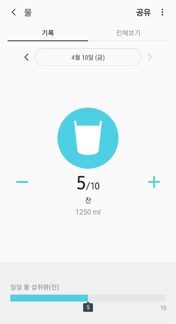 데일리 건강 미션에서 물 마시기를 클릭하면 위에 설명한 "집안환기"와 다르게 삼성 헬스로 이동합니다. 이곳에서 물 마신 횟수를 입력하면 미션은 완료됩니다.