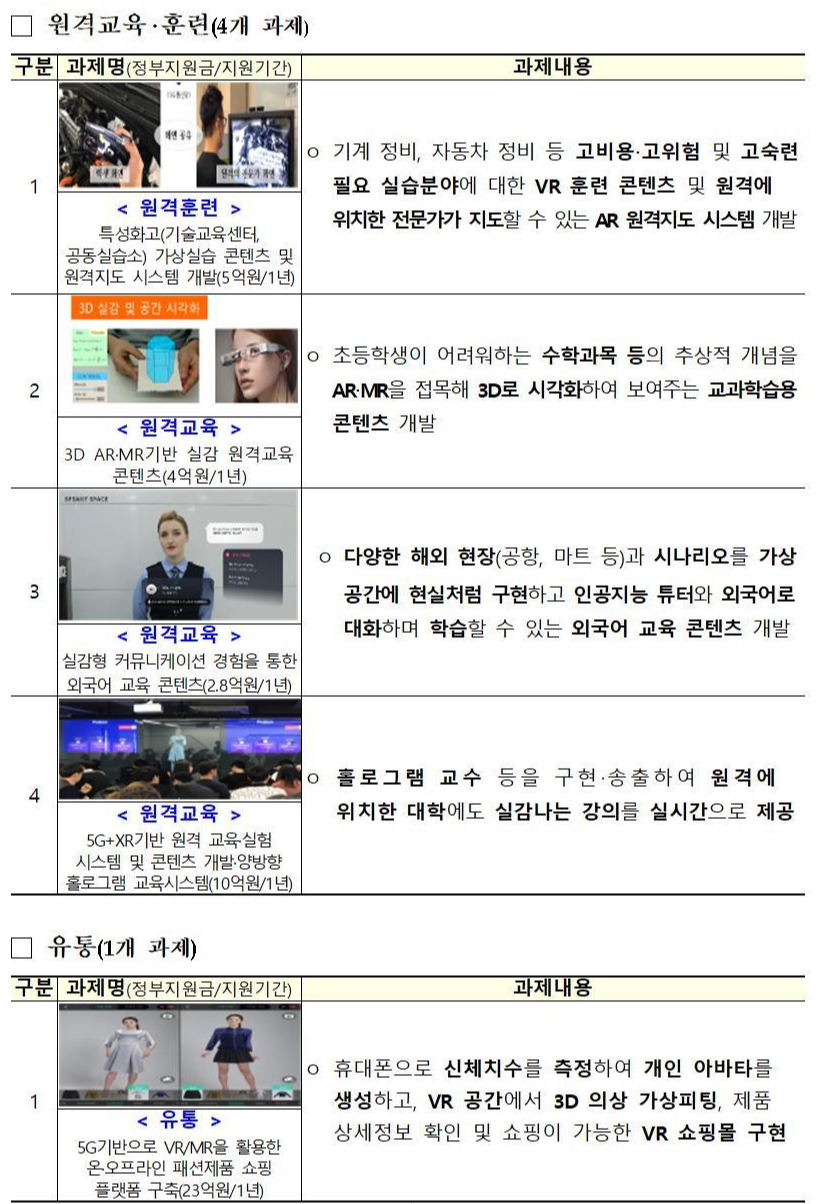 "최근 ‘코로나19’를 계기로 ‘일하고-놀고-소통하는 방식’의 디지털 전환이 가속화될 것으로 전망됨에 따라, 몰입감‧현장감을 높일 수 있는 실감 콘텐츠 비대면 서비스에 대한 관심‧요구가 증가하고 있다."라고 하면서 "VR‧AR을 활용한 비대면 서비스 가능성에 주목, 원격회의‧협업, 교육, 유통 등 비대면 수요가 높고, VR‧AR의 장점을 극대화 할 수 있는 분야별 핵심 비대면 서비스 제작을 지원한다."라고 과기정통부는 말했습니다.
