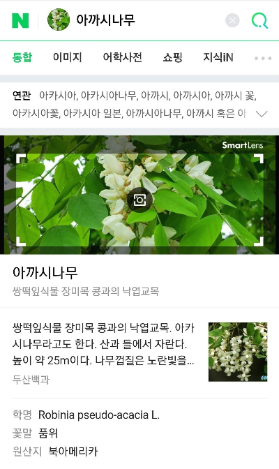 잠시 기다리면 [아래사진]과 같이 스마트 렌즈는 "아까시나무"라는 검색 결과를 알려줍니다.