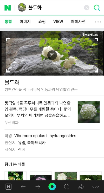 "불두화"라는 식물에도 스마트렌즈를 갖다 대 봅니다. [아래 사진]과 같은 꽃 이름 알려줍니다.
