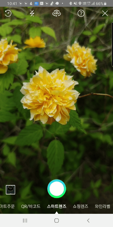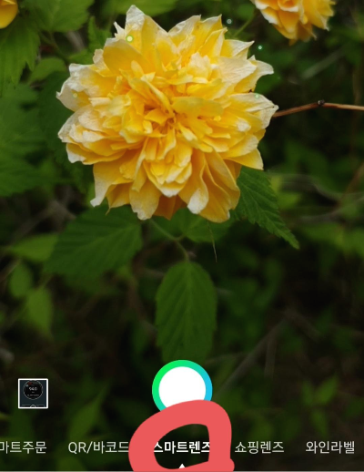 그러면 카메라가 작동하면서 화면은 [아래사진]과 같이 바뀝니다. 여기서 식물이름 즉 꽃이름 검색에 이 화면을 활용하기 위해서는 모드는 "스마트 렌즈"에 위치해야 합니다. 만약에 QR/바코드, 쇼핑렌즈 등 모드로 되어 있다면 드래그를 통해 "스마트렌즈" 모드로 맞춰 주세요.